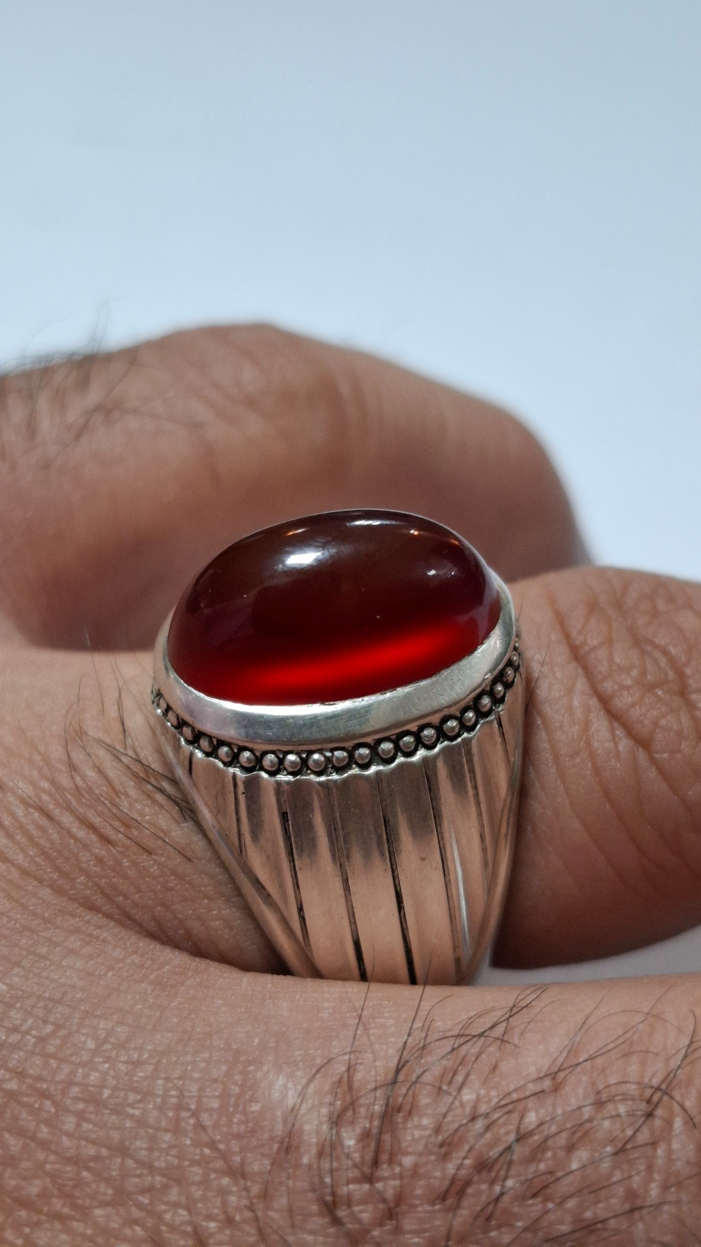 انگشتر عقیق سرخ تیغ آبدار سنگ دامله واصیل رکاب استاد بصیری سایز 61. 62 وزن 26 گرم