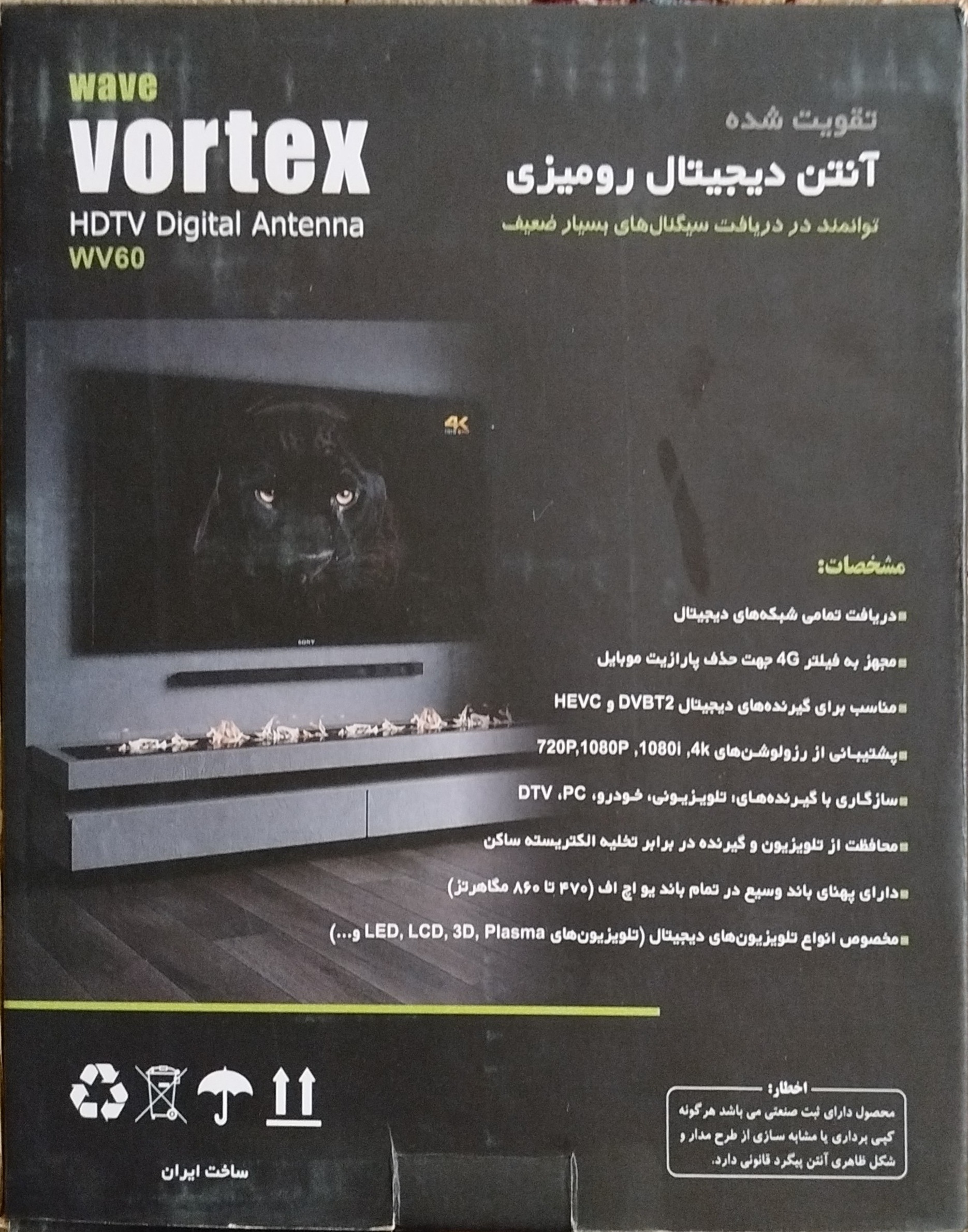 آنتن رومیزی ویو ورتکس مدل WV60 جدیدترین محصول تولید شده از شرکت ویو ورتکس می باشد . ایرادات سری جدید این محصول نسبت به گذشته رفع شده و به منظور حذف نویز ، سیستم برق 220 ولت حذف و برق USB پنج ولت جایگزین آن شده است . همچنین با اضافه شدن کابل 3 متری به آنتن ،امکان انتخاب بهترین مکان جهت دریافت سیگنال قوی تر را به شما میدهد .توصیه میشود از این آنتن برای طبقات یک به بالا استفاده کنید. برای استفاده از این آنتن، داشتن گیرنده دیجیتال یا گیرنده دیجیتال داخلی تلویزیون الزامی می باشد. اتصال برقUSBآنتن به آداپتور یو اس بی دار(شارژر موبایل ) یا درگاه USBتلویزیون یا گیرنده الزامی می باشد. به منظور راه اندازی آنتن کافیست فیش USB آنتن را به پورت USB دستگاه گیرنده دیجیتال یا تلویزیونو یا به آداپتور 5 ولت متصل کنید و از روشن شدن چراغ LED روی آنتن اطمینان حاصل نمایید. سپس با قرار دادن آنتن در فاصله 1 متری یا بیشتر از تلویزیون ، جستجوی اتوماتیک شبکه ها را شروع کنید و در انتها شبکه ها را ذخیره کنید . دقت فرمایید شبکه های HD جدید صدا و سیما با کیفیت HEVC پخش میشوند و گیرنده شما برای دریافت این شبکه ها باید از نوع HEVC پشتیبانی کنند .