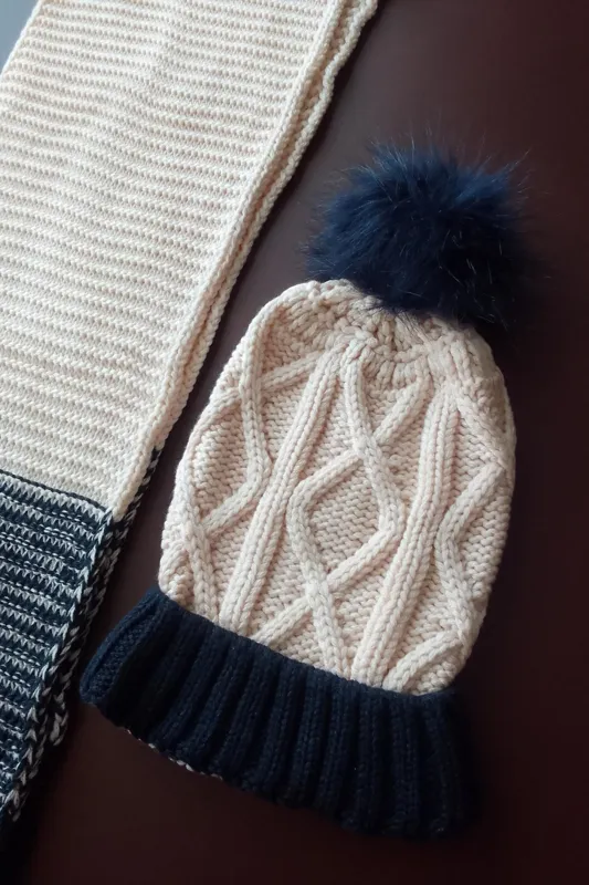 شال و کلاه شالگردن بافتنی خز دار کرم سرمه ای
