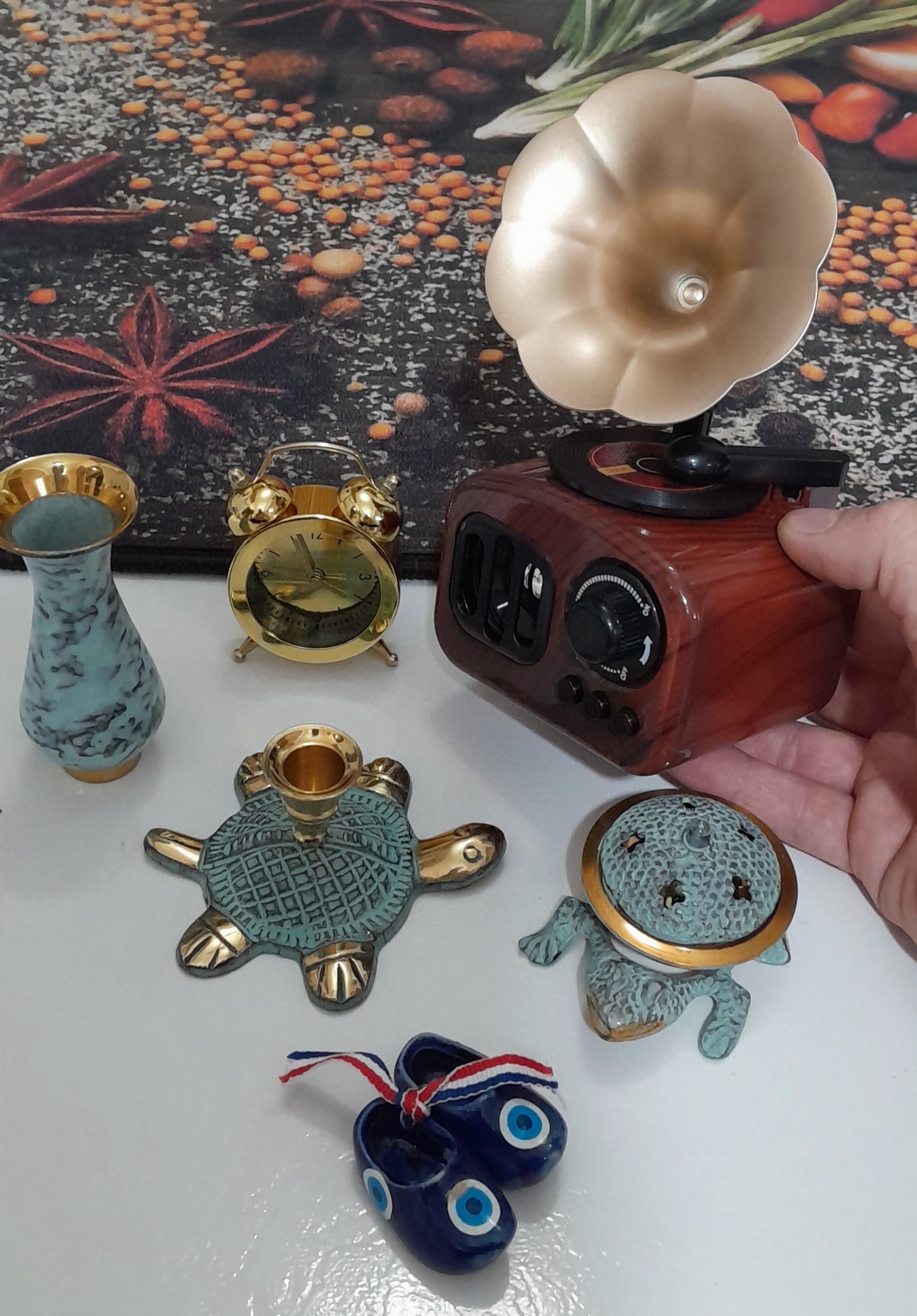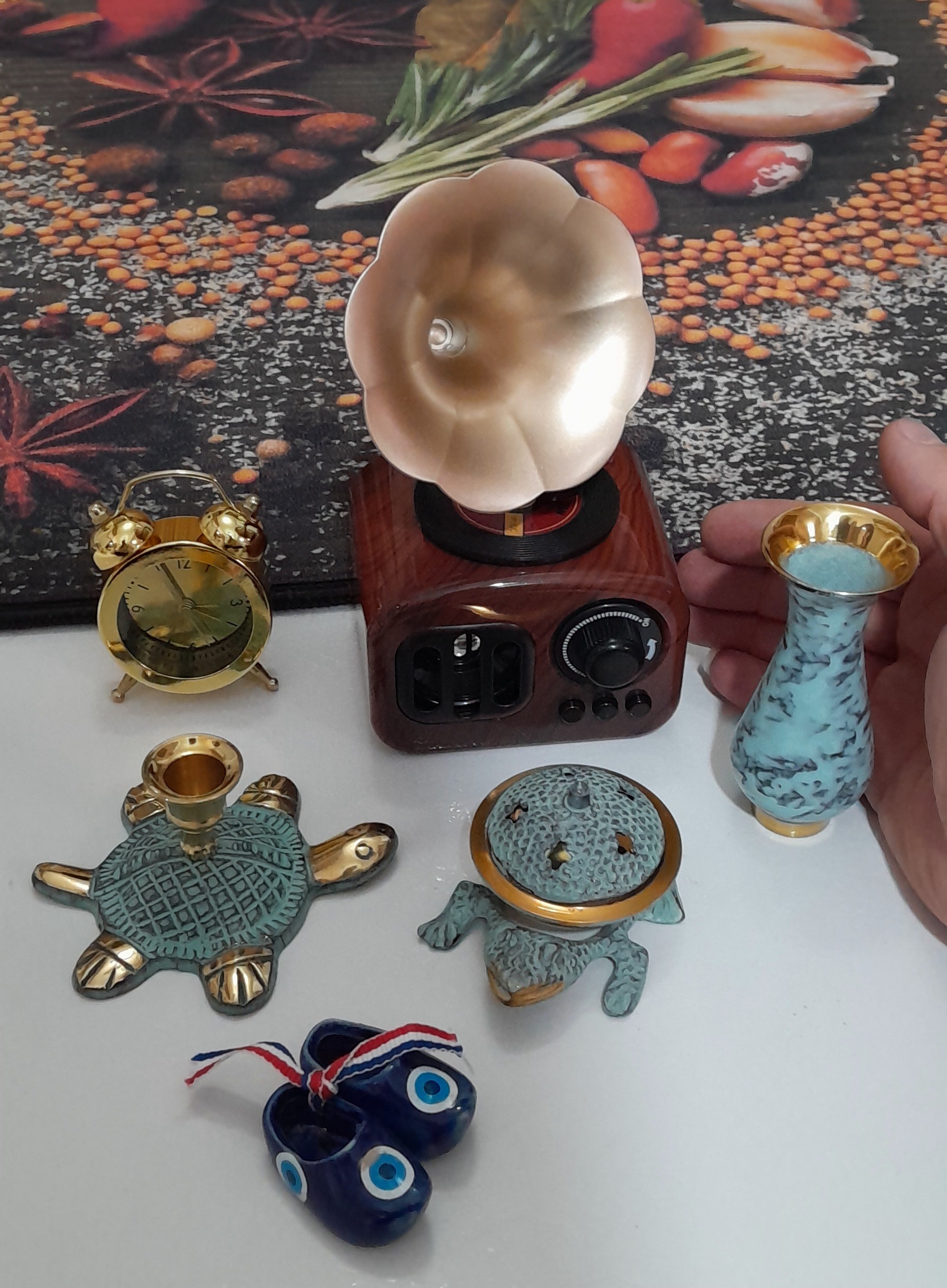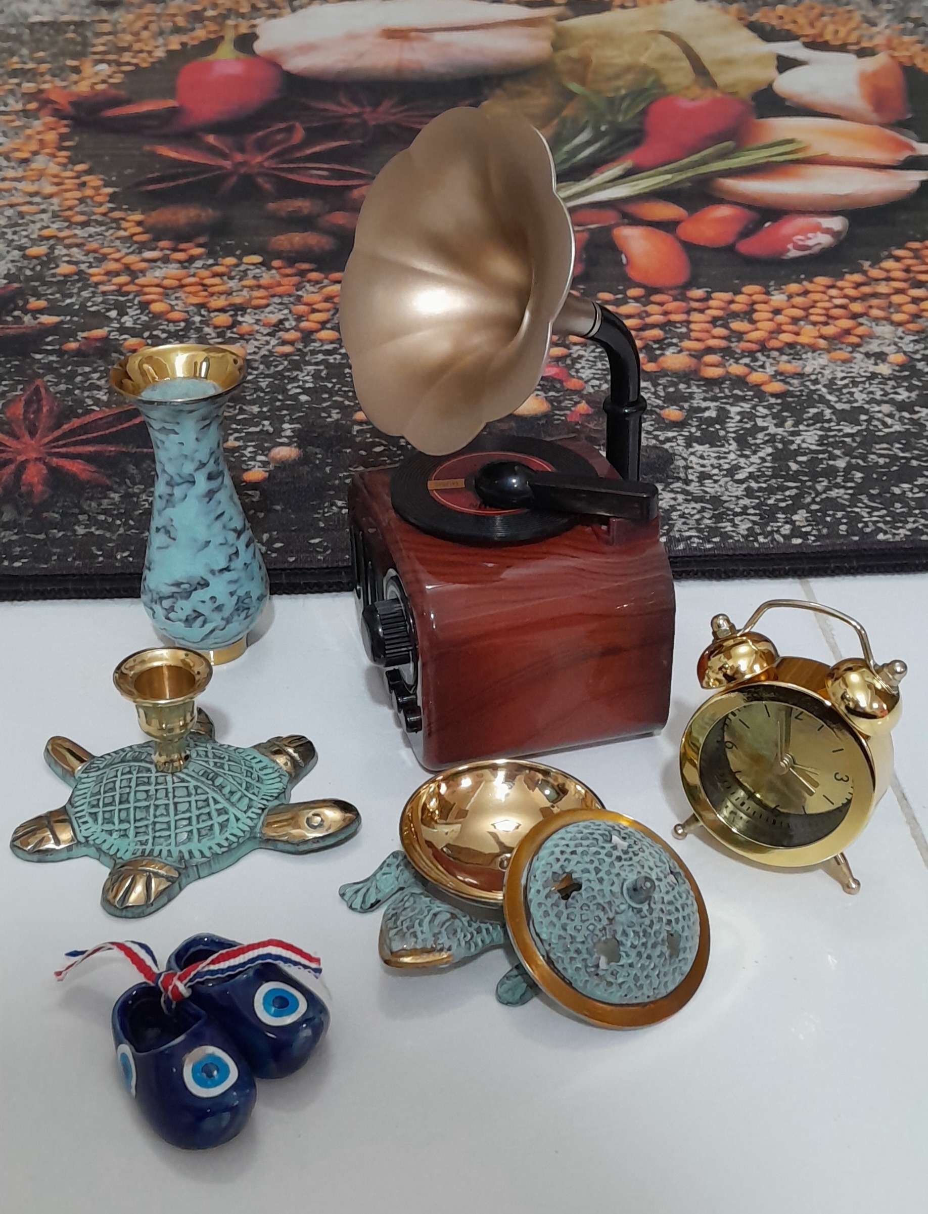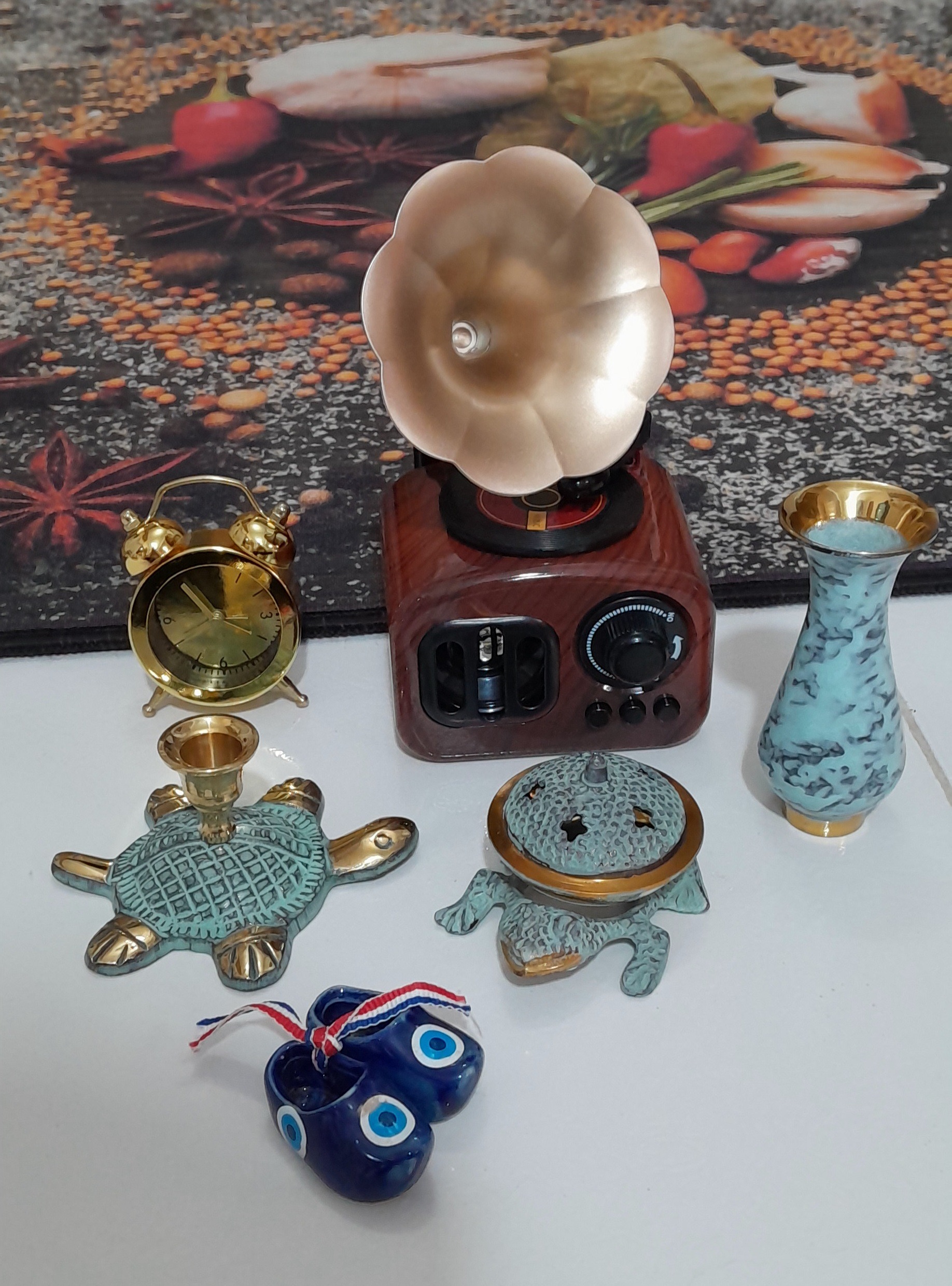 گلدان و عودسوز و جاشمعی جنس برنجی ضخیم آنتیک فیروزه ای میباشد، گرامافون طرح چوب موزیکال میباشد و ساعت فلزی زنگخور میباشد.