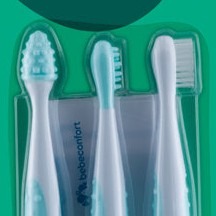 کیت 3 مسواک Bebeconfort شامل برس های چند مرحله ای و محرک لثه برای کمک به بهداشت دهان و دندان کودک است.