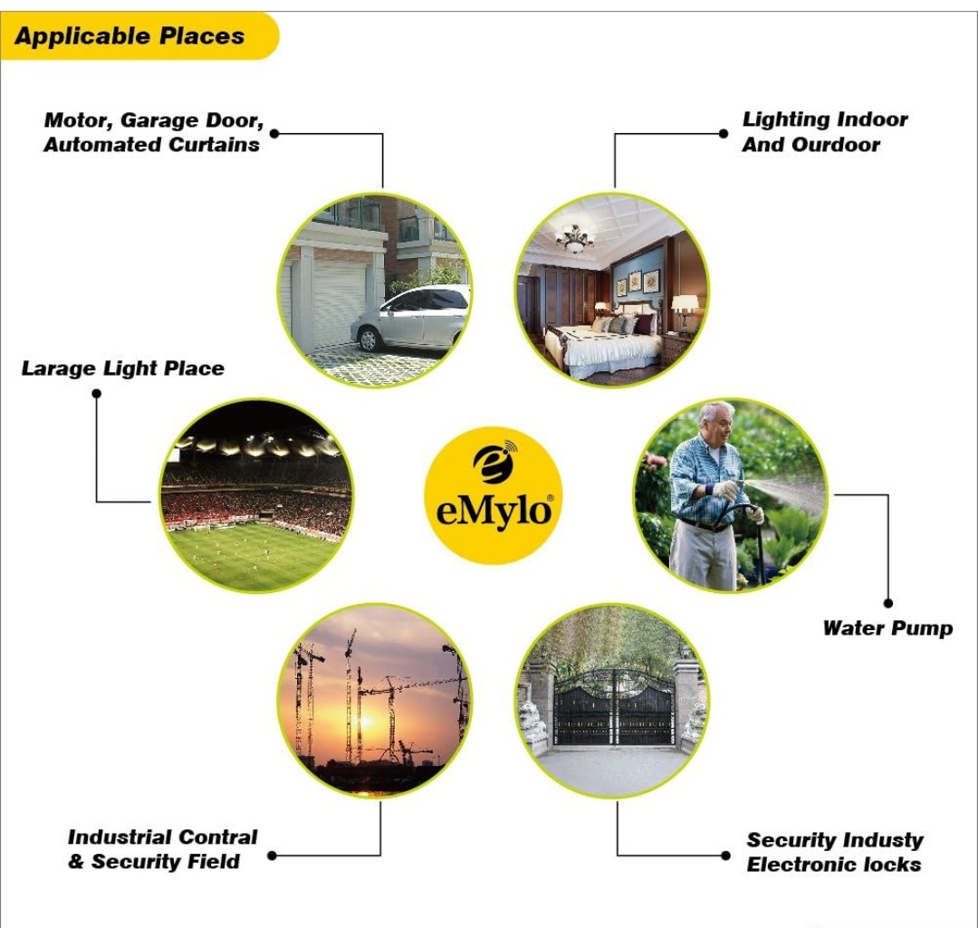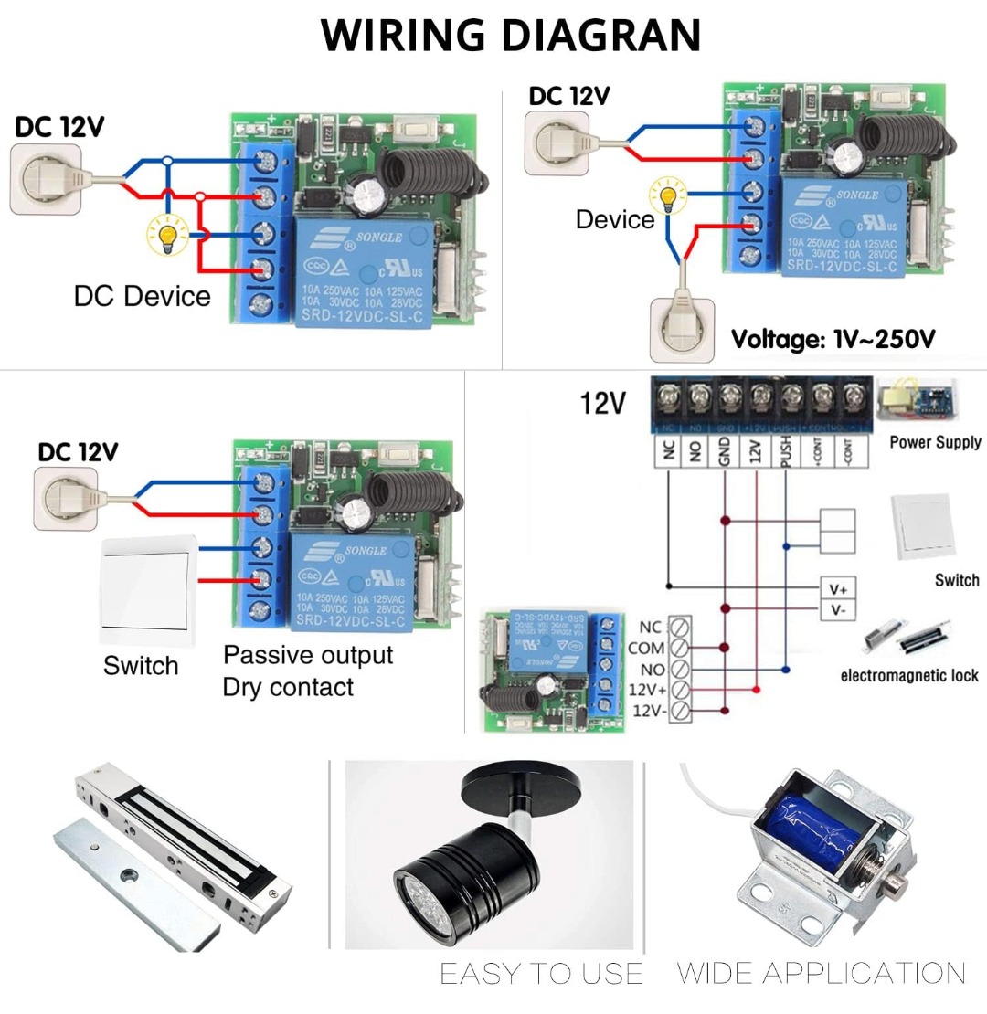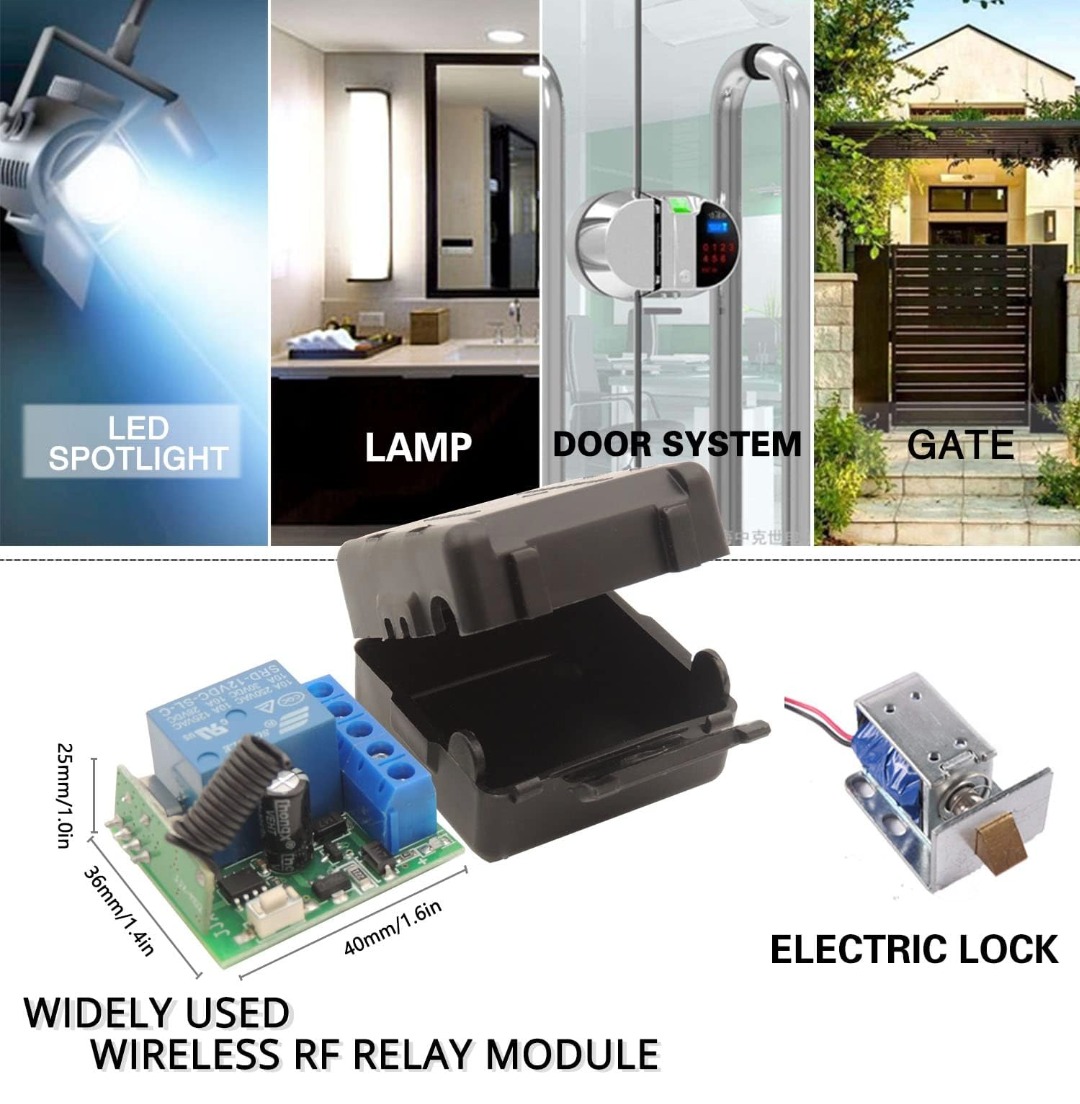 کاربرد گستردهمحصولات را می توان در خانه ها، مزارع، کارخانه ها، ادارات، آزمایشگاه ها، سوپرمارکت ها و غیره استفاده کرد. شما می توانید از راه دور هر دستگاهی را که به گیرنده رله متصل می شود از طریق کنترل از راه دور کار کنید. مانند قفل برقی، درب الکترومغناطیسی، فن، لامپ، روشنایی، دستگاه تهویه، پمپ آب، انتقال سیگنال و سوئیچ کنترل از راه دور DIY.