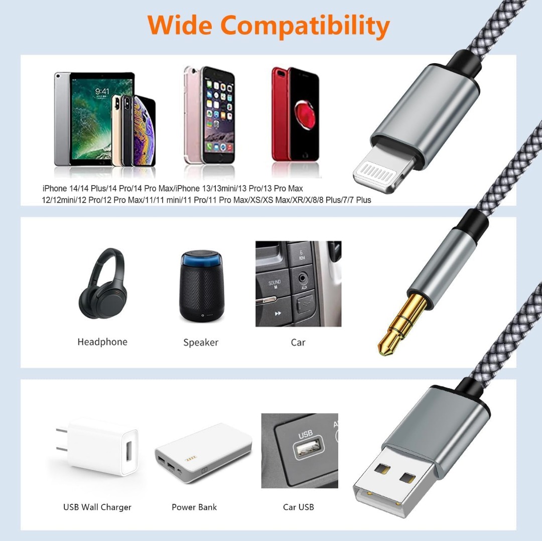 دستگاه سازگاراین کابل شارژ صوتی USB + AUX از جدیدترین تراشهها استفاده میکند، با اکثر دستگاههای اپل سازگار است، مانند iPhone 14 13 12 11 XS XR x 8 7 6، iPod Touch، iPad، iPad، iPad MINI/IPAD AIR/IPAD PRO و موارد دیگر به بلندگو، هدفون، تقویت کننده برق بلندگوی خودرو AUX.
