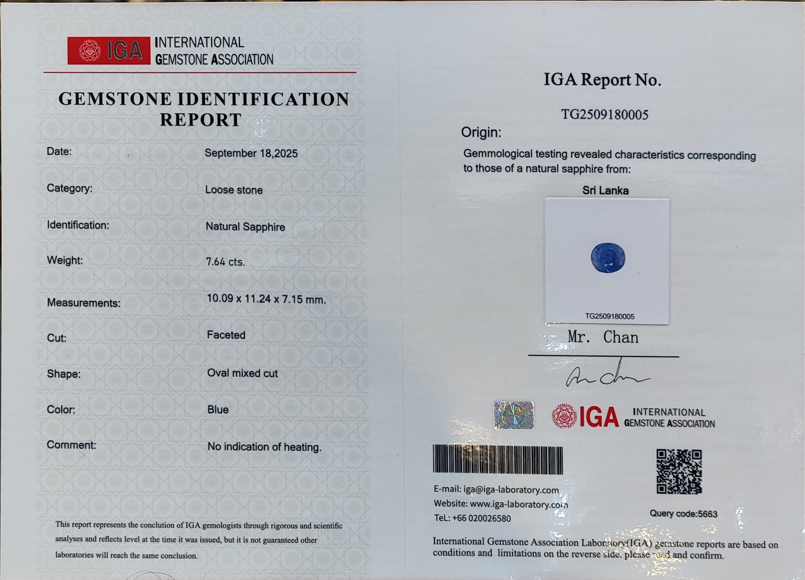 یاقوت کبود انهیت سریلانکا وزن 7/64 قیراط با شناسنامه معتبر بین المللی قابل استعلام