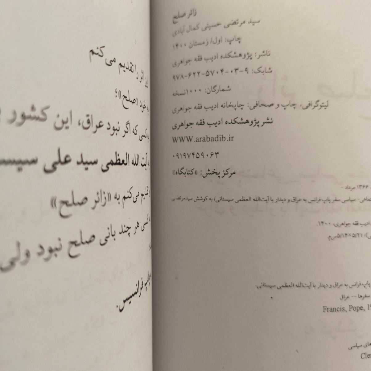 کتاب زائر صلح ( بررسی سفر پاپ به عراق و دیدار با آقای آیت ا... سیستانی) کتاب نو و مناسب هدیه دادن است و صرفاً به خاطر یکی دو بار مطالعه کیفیت در حد آک ذکر شده و بدون هیچ خط خوردگی یا پارگی صفحات هست.