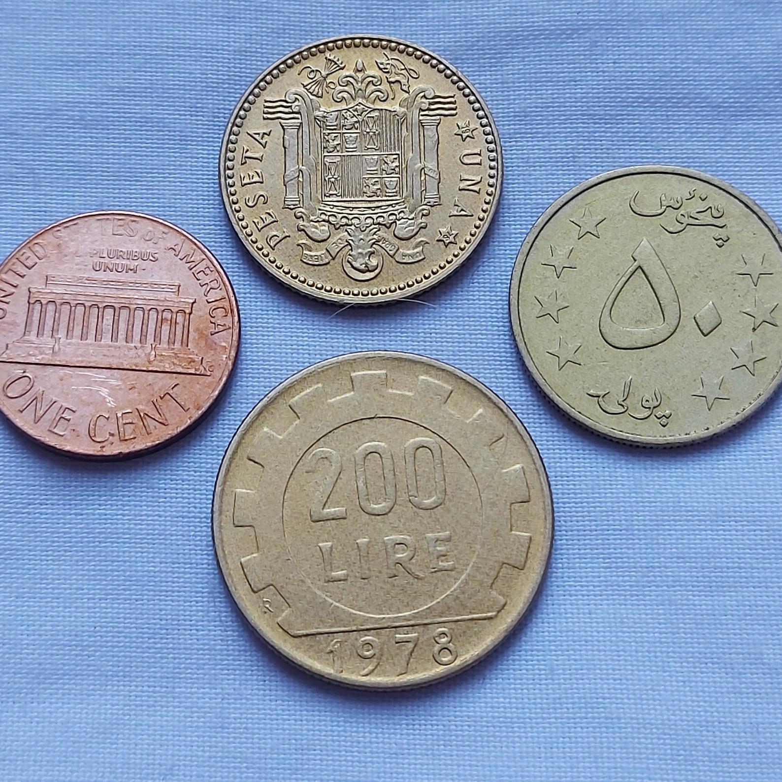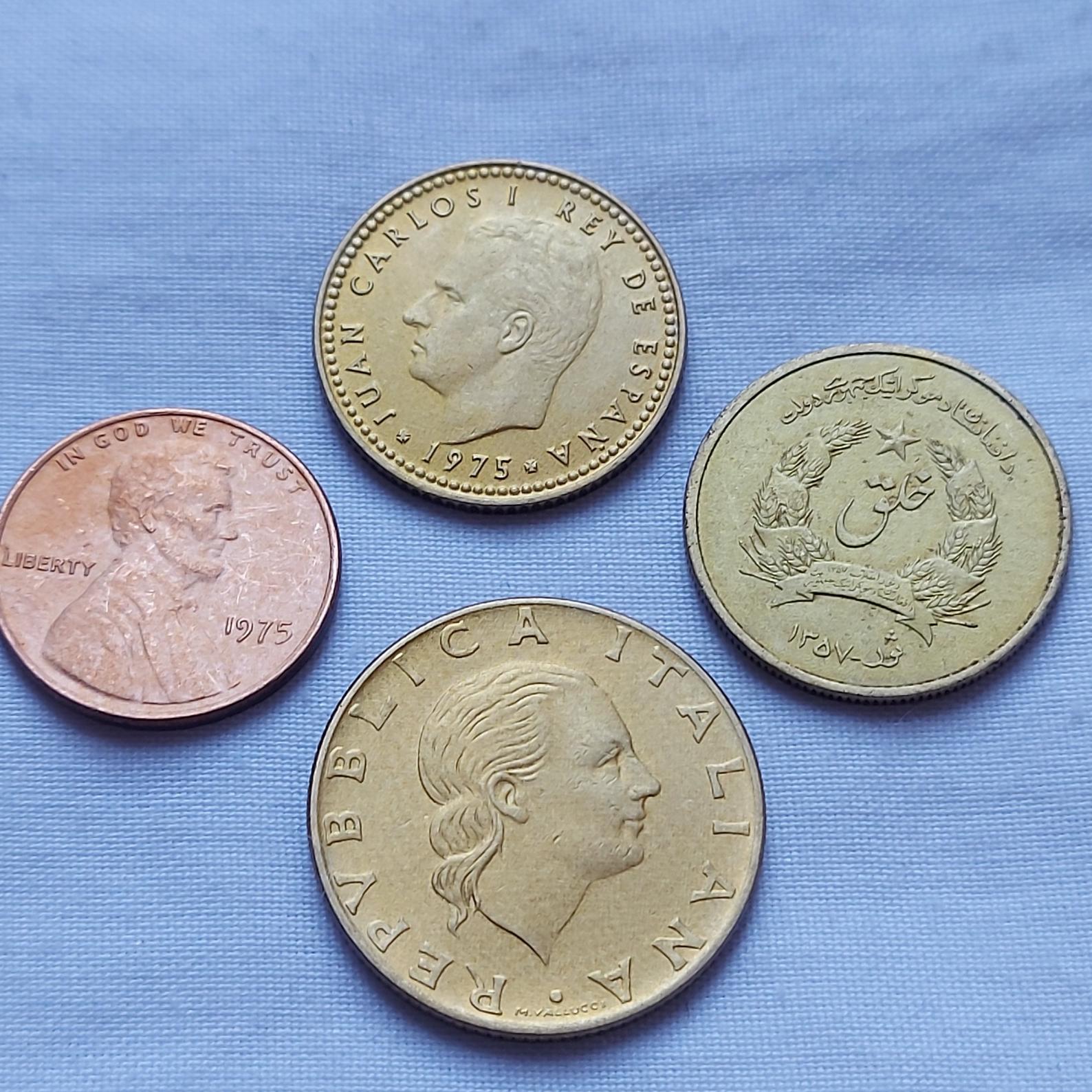 سکه 1 سنت آمریکا 1975 - سکه 50 پنحوس افغانستان 1357 شمسی - سکه 1 پزوتا اسپانیا 1975 - سکه 200 لیر ایتالیا 1978
