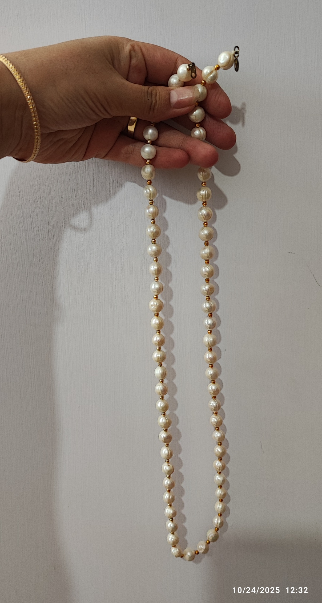 اصل و سنگین و بسیار زیبا، گردنبند بلند و حالت رو لباسی داره، کلا یکی دو بار بیشتر استفاده نشده، فلزش نقره نیست، اما مروارید اصل و بزرگ و خوش رنگ و با کیفیت داره، ارسال رایگان