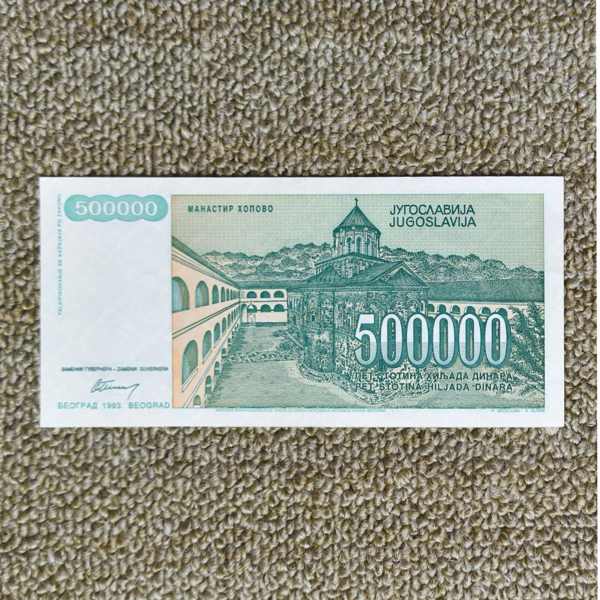 اسکناس 500هزار دینار یوگسلاوی از سری مشهور میلیاردی1993 میلادی و بعد از اصلاحات ارزی، با تصویری از با تصویری از «دوسیتی اوبرادوویچ» از چهره های تاثیر گذار رنسانس ملی و فرهنگی یوگسلاوی سابق و صربستان امروزی.
