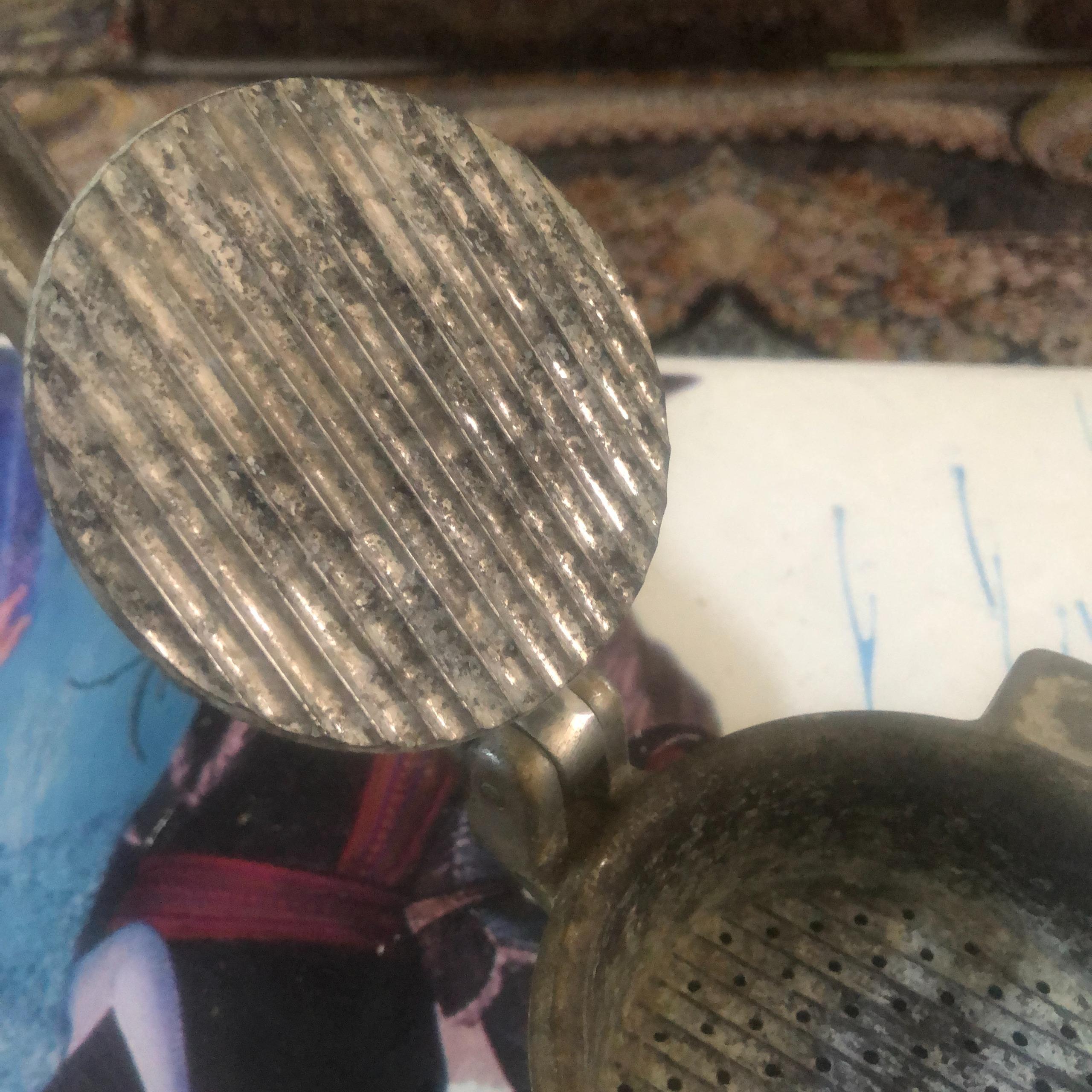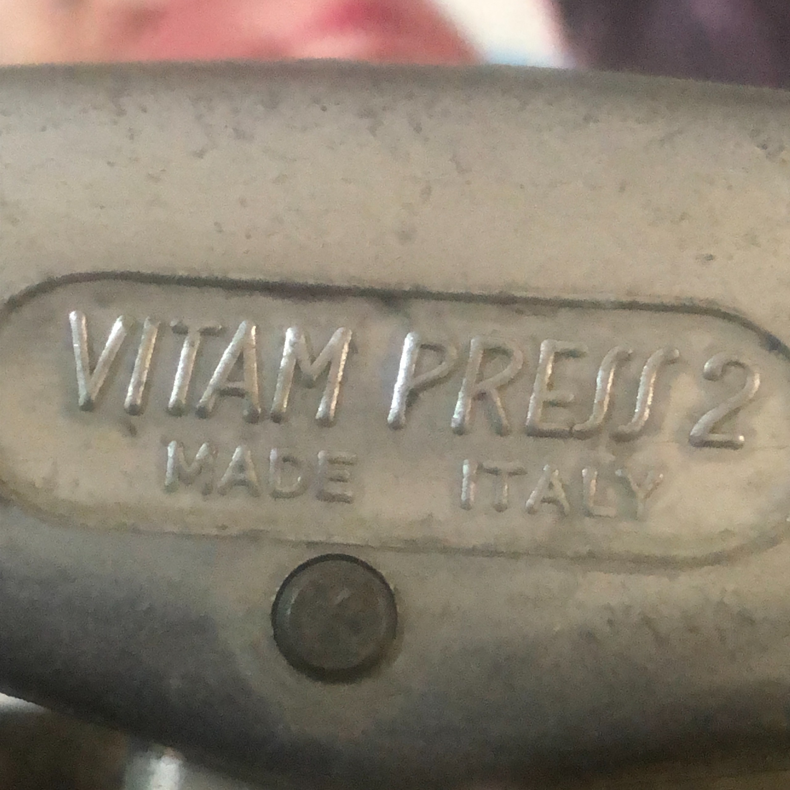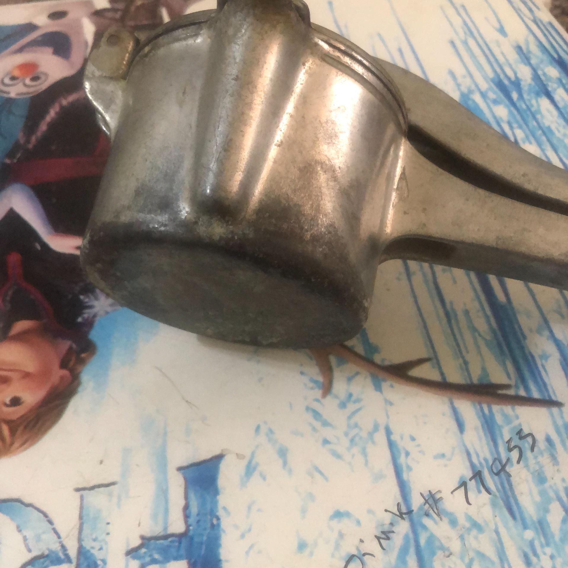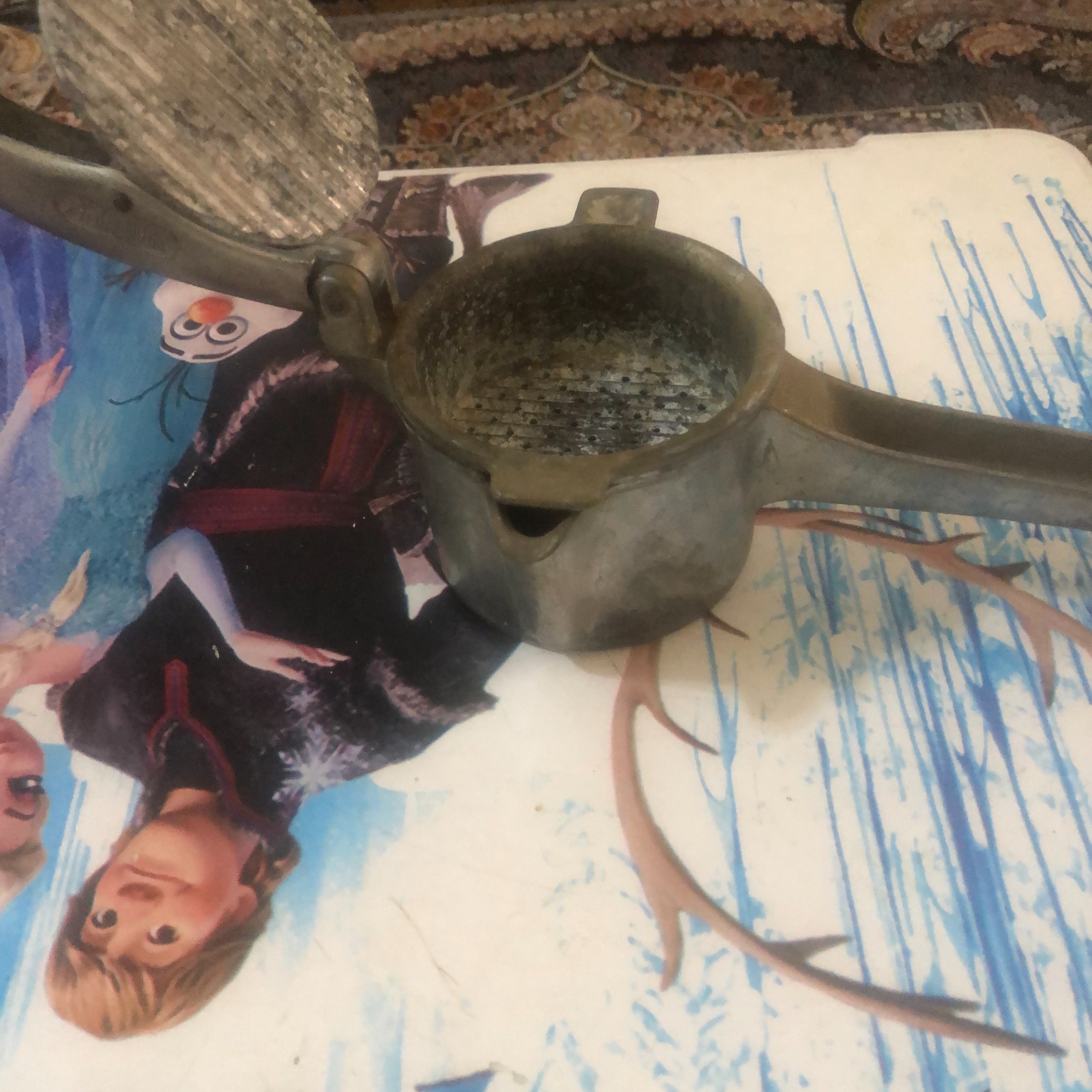 آب انارگیری دستی بسیار قدیمی که ظاهرش نیاز به تمیزکاری اساسی داره و کدت زیادی تو انبار خوابیده بوده جنس بدنش آلومیتیوم خشکه یا چدن هست نمیدونم فقط رنگش سیاه شده و شوره سبز زده یک کم