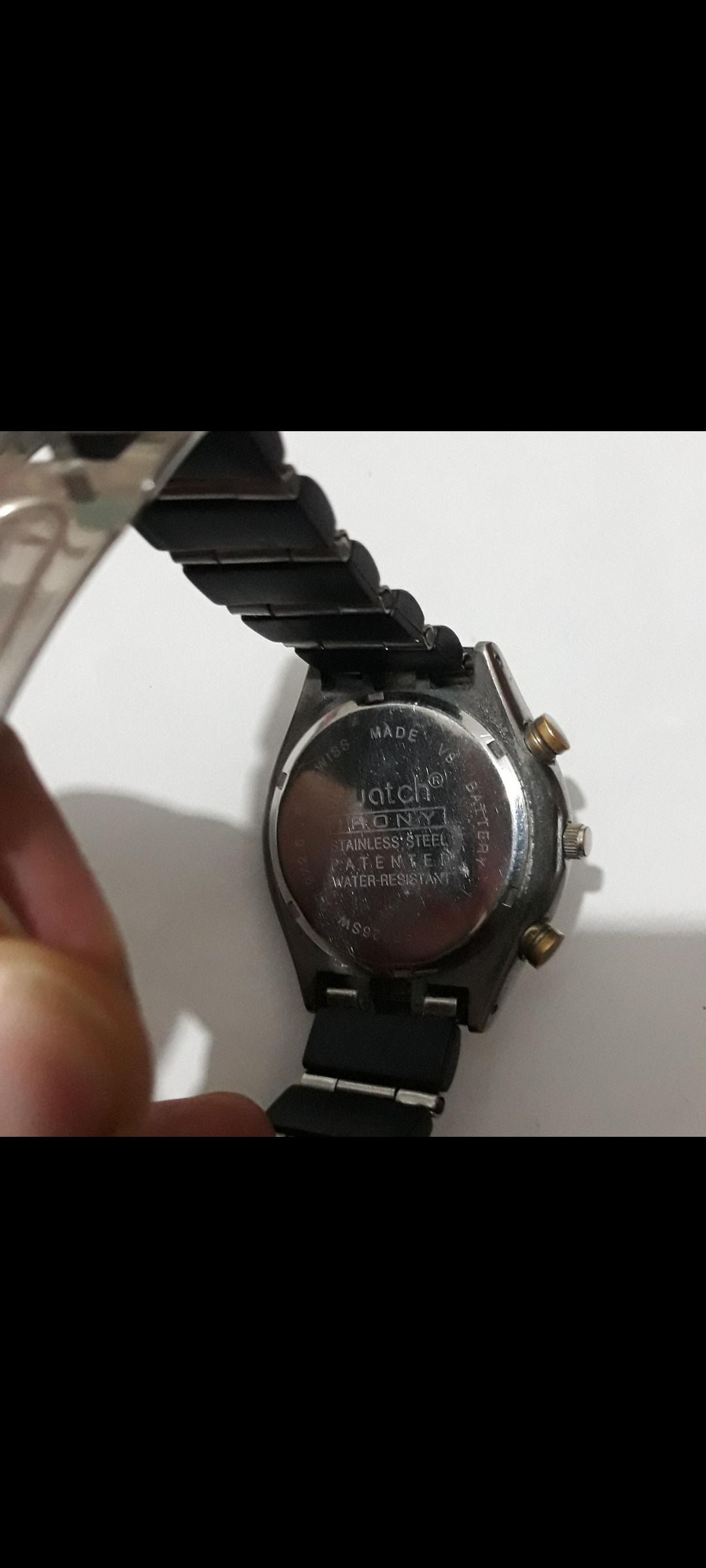ساعت کپی سواچ هست رنگ صفحه فوق العاده عالی هست شیشه سالم بدنه سالم ولی موتور کار نمیکنه با باتری حالا ایرادش چی من نمیدونم بند هم بند ساواچ نیست بندی انتخاب شده هم رنگ و عالی باشه فلزی پلمیری هم هست بند  در کل اینه و زیباست پول بندش هست که زدم