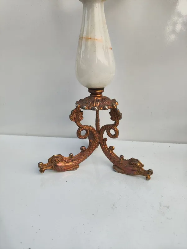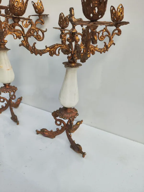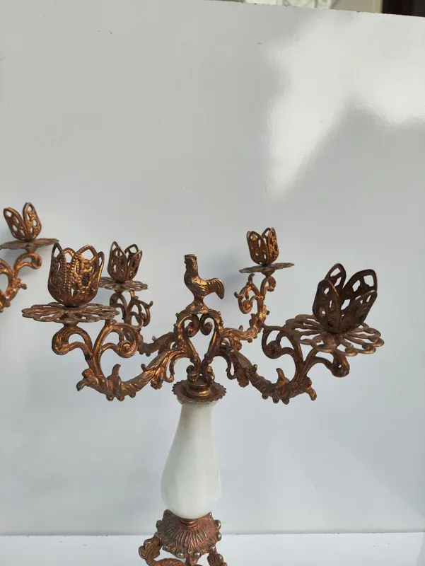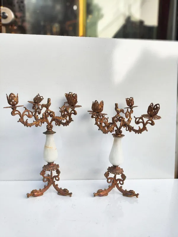 جفت شمعدان برنزی آب طلا قدیمی مرغک دار و زیبا و آنتیک ارتفاع 32. قیمت جفت