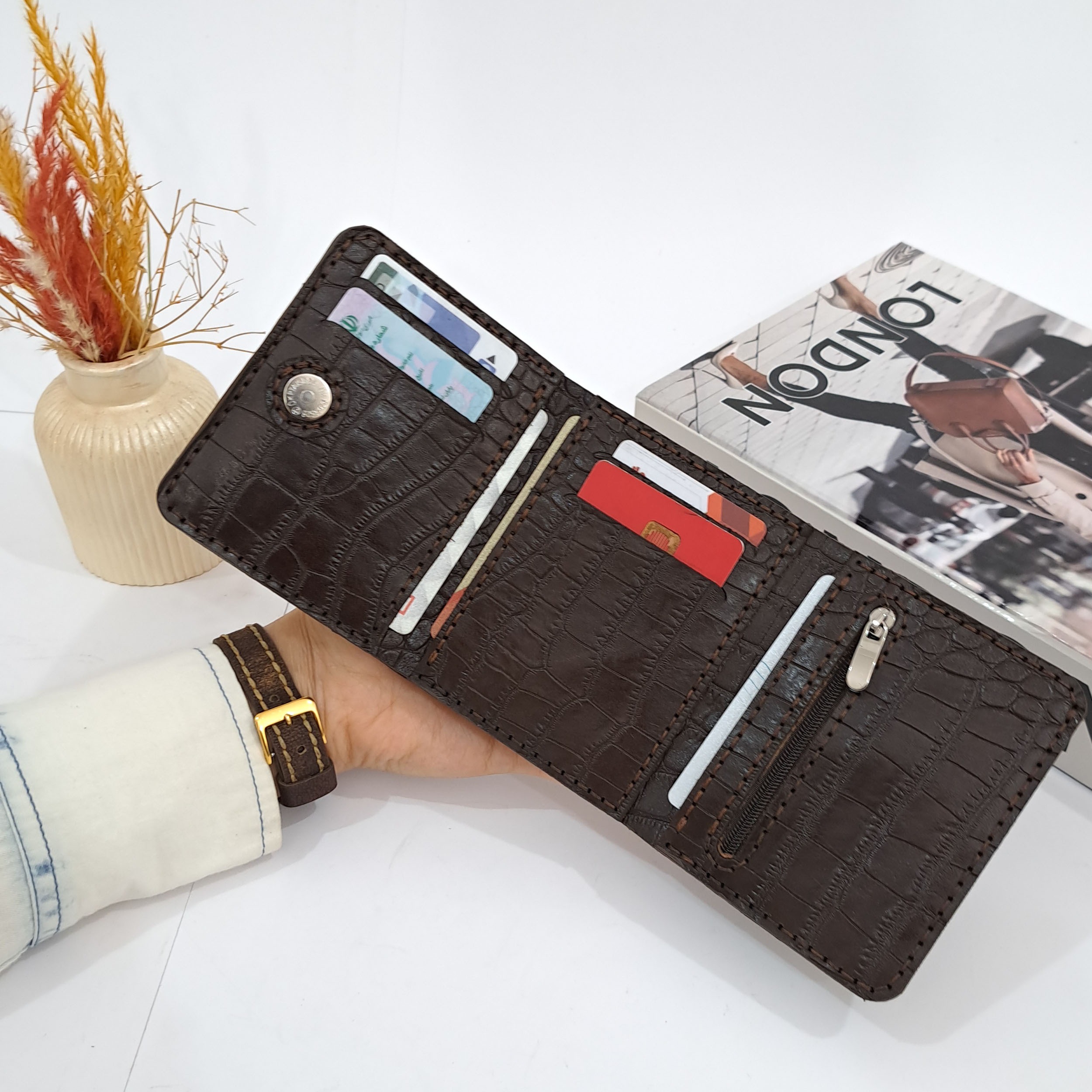 کیف پول جیبی چرم طبیعی قهوه ای مدل 3 لت