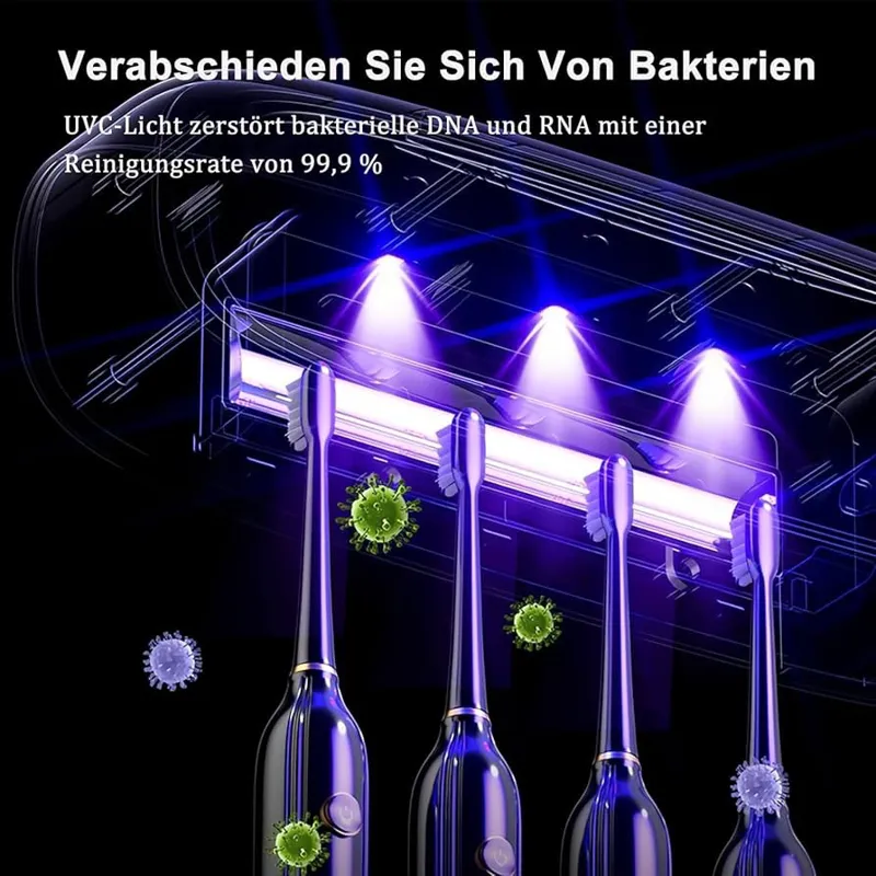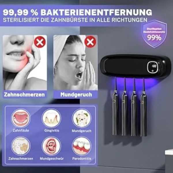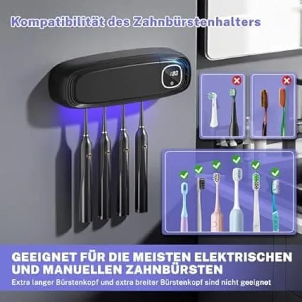 ضدعفونی کننده مسواک با اشعه ماوراء بنفش، جا مسواکی دیواری، عملکردهای استریلیزاسیون و زمان بندی، با 4 جایگاه برس برقی مسواک، عملکرد خشک کردن، شارژ 3000 میلی آمپر ساعت، شارژ USB (مشکی)