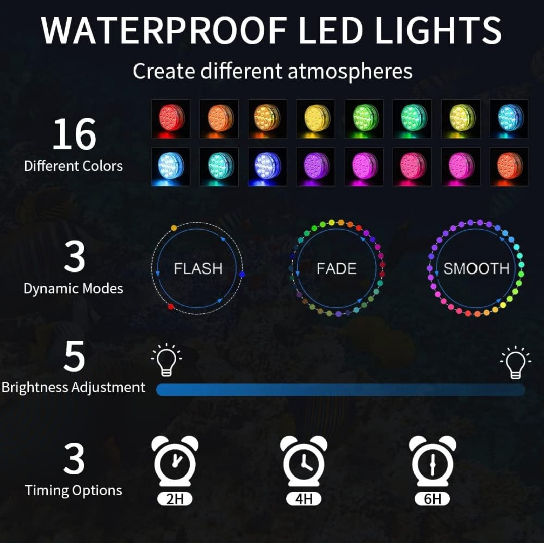 طیف کاربرد گسترده: چراغهای تزئینی LED زیر آب، روشنایی جوی شما برای حمام است. این چراغهای LED برای انواع سناریوهای روشنایی مناسب هستند و میتوانند در داخل و خارج از منزل استفاده شوند. از چراغها به عنوان تزئین کدو تنبلهای هالووین استفاده کنید. آنها همچنین برای تزئینات فانوس هالووین، استخرهای شنا، گلدانها، عروسیها، آکواریومها، تنگهای ماهی، برکهها، فوارهها، مهمانیها، راهروها و موارد دیگر مناسب هستند!