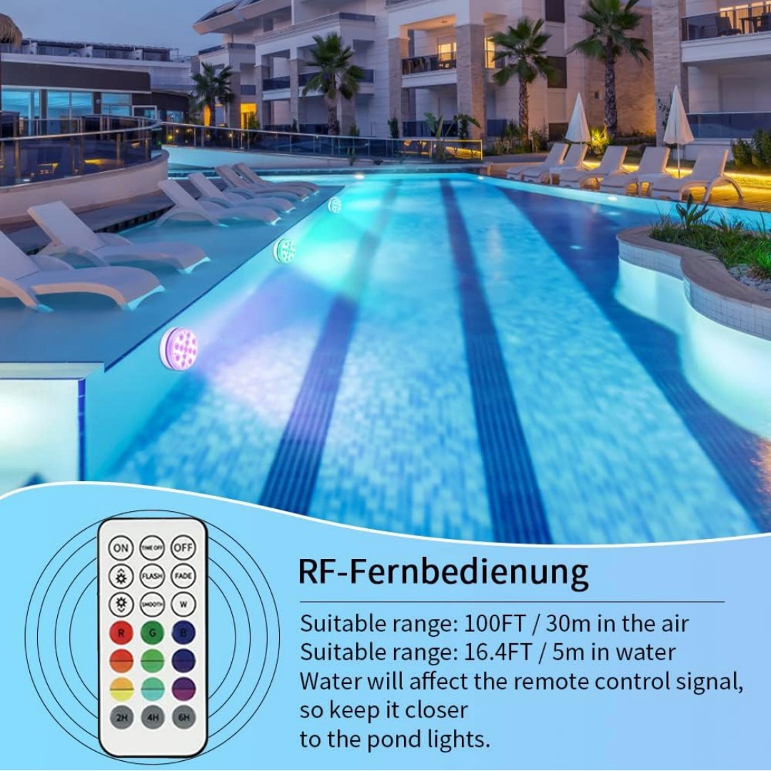 کنترل از راه دور و تایمر RF: چراغهای استخر زیر آب LED ما را میتوان به راحتی با یک کنترل از راه دور RF کنترل کرد. برد کنترل از راه دور میتواند تا 50 متر در هوا و 5 متر در زیر آب برسد. با یک کنترل از راه دور، میتوان چندین چراغ را همزمان کنترل کرد و به راحتی رنگ، روشنایی و تایمر روشنایی را تنظیم کرد.