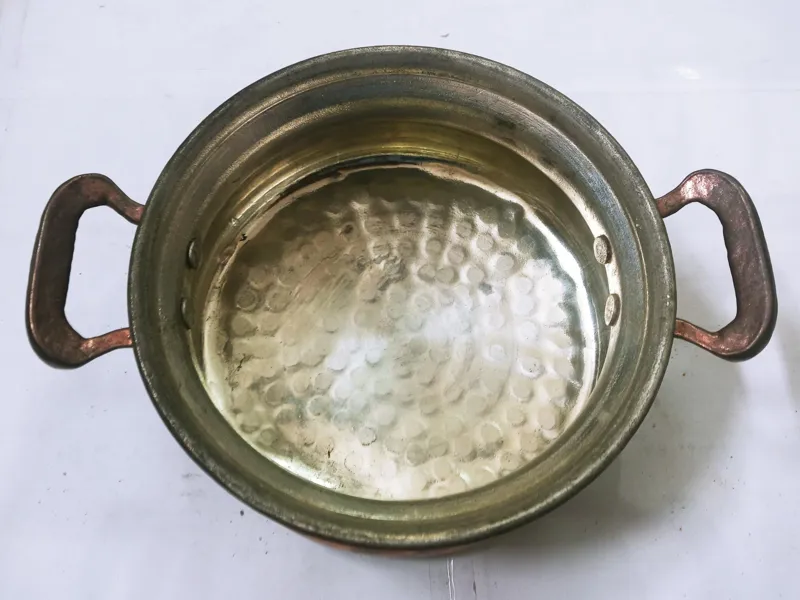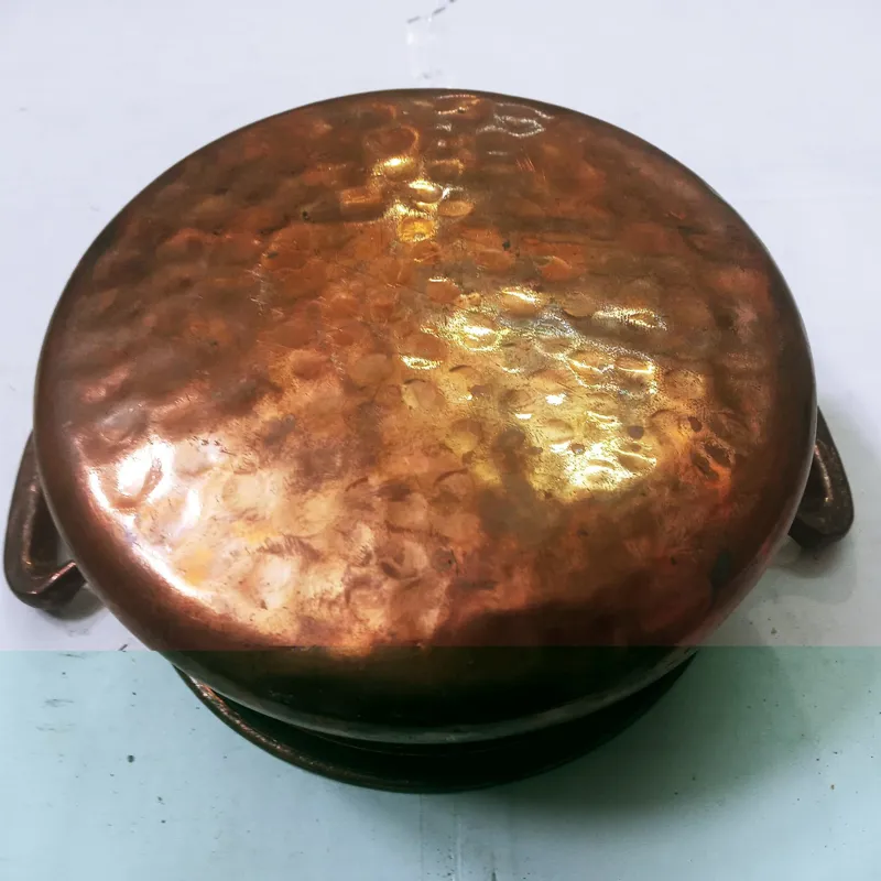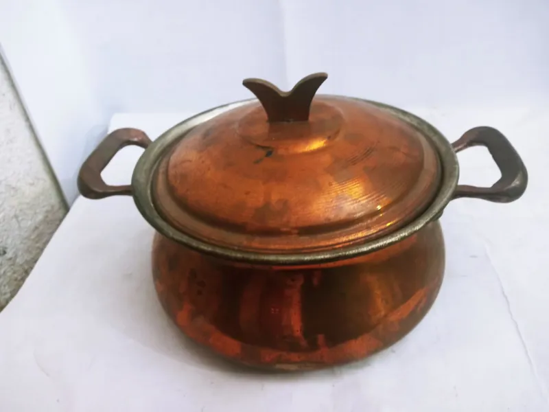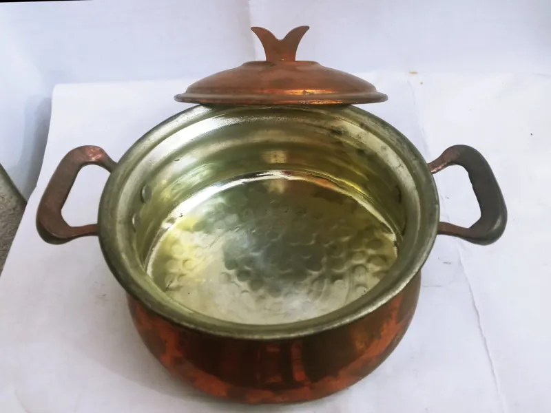قابلمه مسی چکشی کار زنجان کاملا نونو یه ذره از داخل ضرب خورده قطر قابلمه بدون دسته 17 و ارتفاع 9 سانت.