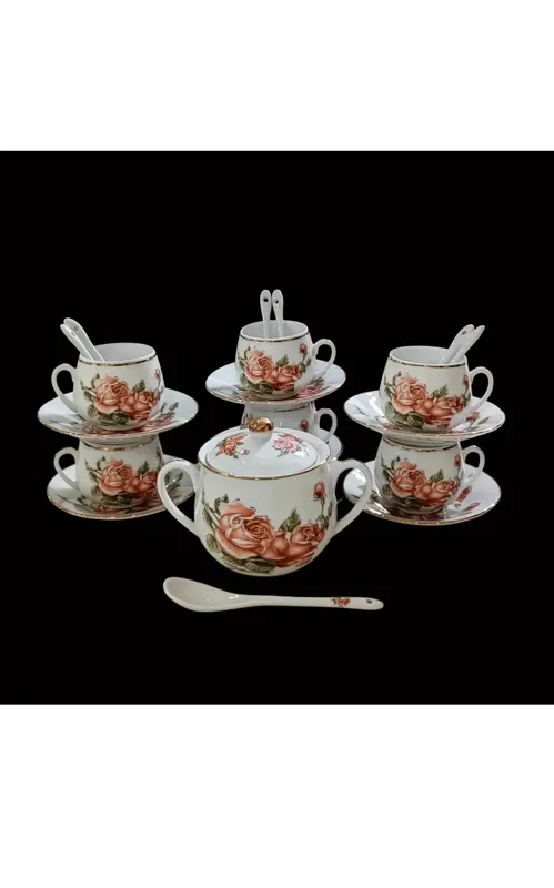 شامل: 6عدد فنجان ،6عدد نعلبکی,7عدد قاشق (6عدد کوچک 1عدد بزرگتر برای شکر)،2 پارچه هم قندان با درش