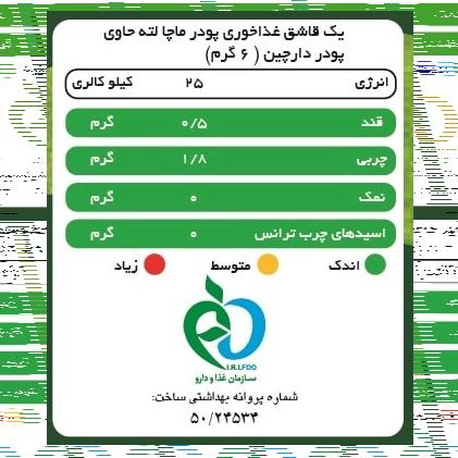 - ترکیبات: پودر ماچا تشریفاتی، پودر دارچین، پودر شیر غیرلبنی و استویا (شیرین کننده بدون کالری)