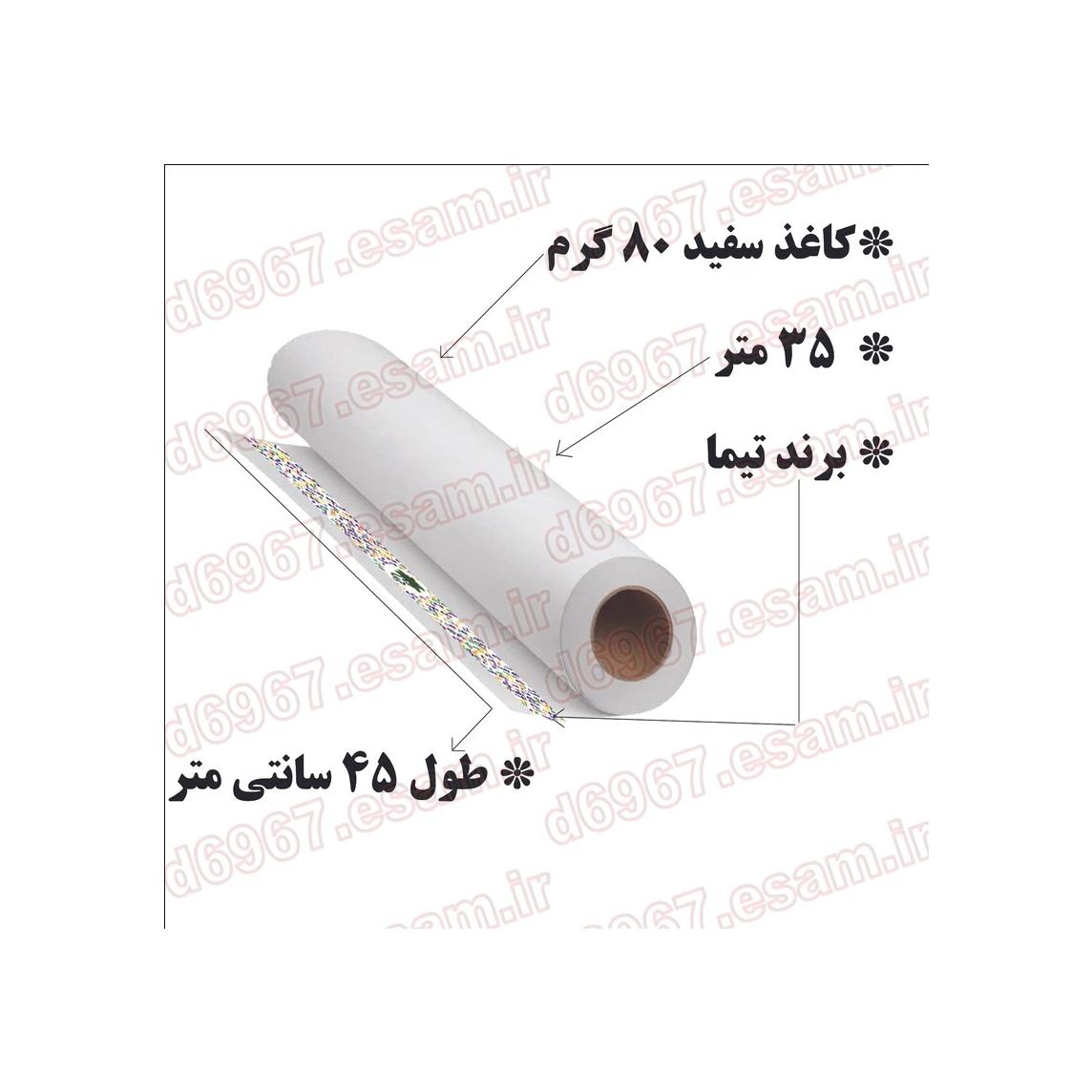 رول کاغذی تیما به عرض 45 سانتیمتر و طول 35 متر از جنس کاغذ تحریر 80 گرم می باشد. کاغذ دارای ظاهری سفید، بافتی متراکم و محصول کشور اندونزی می باشد. این رول انتخاب مناسبی برای انواع مصارف خانگی ، طراحی و نقاشی ، رسم الگو و نقشه های مهندسی