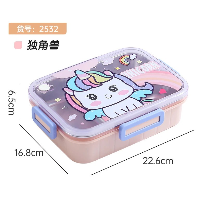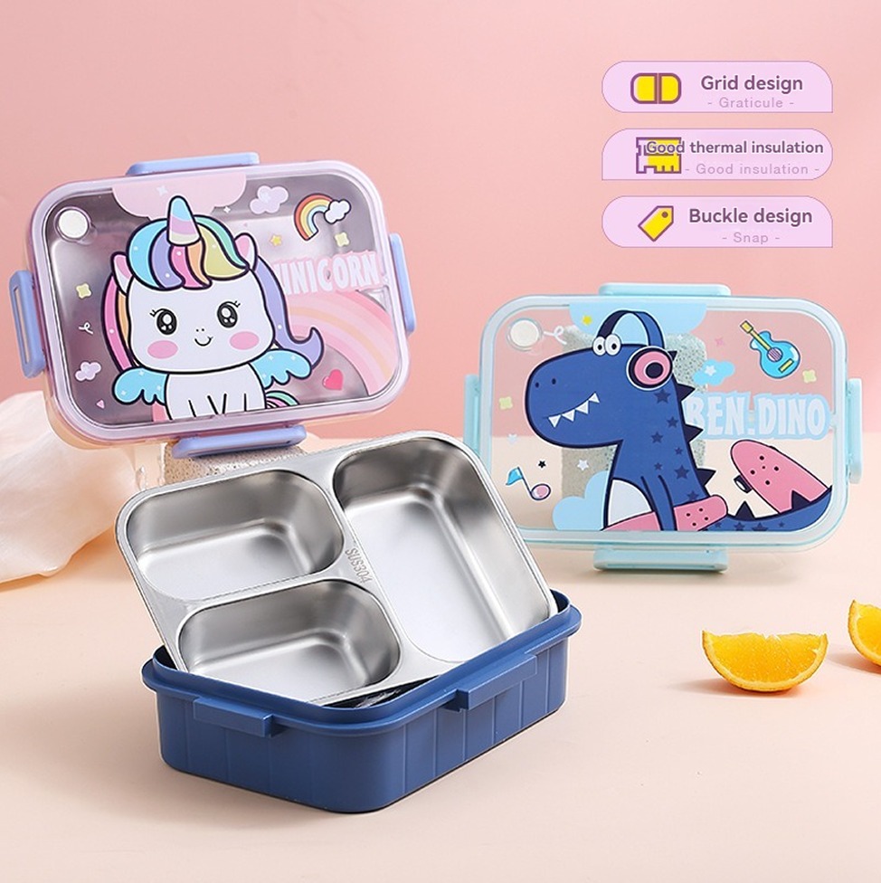 ظرف غذای استیل ضدزنگ NYOBA مدل 2532 با طراحی کارتونی فانتزی، سهخانه داخلی و درب مقاوم، مناسب استفاده روزمره، مدرسه و محل کار است.