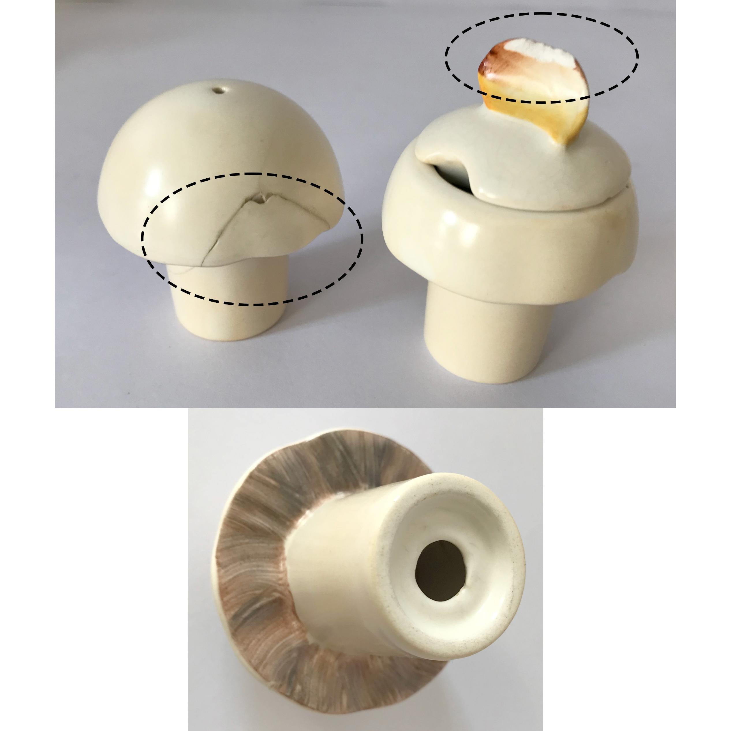 یکی از ست ها کاملا سالم است. ولی ست دیگر چنانکه در عکس آخر مشاهده می فرمایید فلفل پاش با چسب ترمیم شده و فاقد درپوش لاستیکی کف است و بالای درب ظرف ادویه اندکی نیز شکستگی دارد.