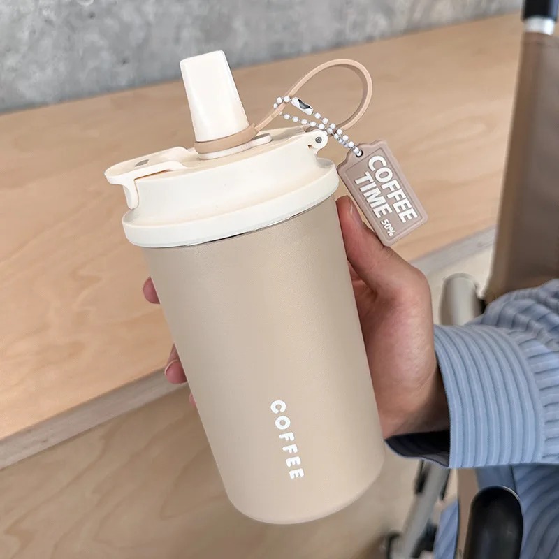 تراول ماگ استیل برند Coffee اورجینال مدل ZY-176 ظرفیت 500 میلیلیتر طراحی مدرن با درب لیوانی و دستهی حمل، رنگبندی کرمی و قهوهای، عایق حرارتی بالا مناسب استفاده روزمره، محل کار و سفر