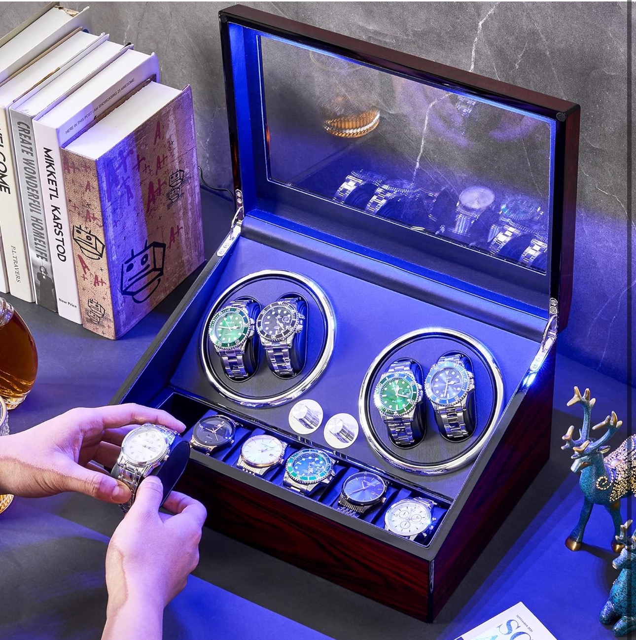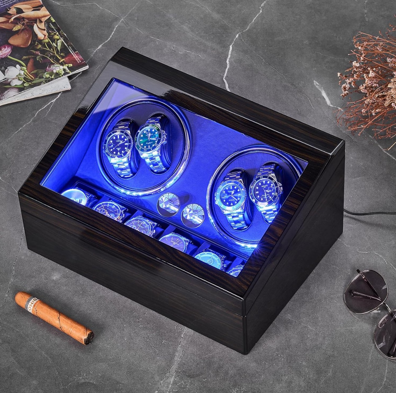 کوککننده ساعت 4ƴ: 4 جایگاه کوککننده و 6 جایگاه نگهداری برای سازماندهی ساعتهای شما. 4 بالشتک ساعت با حلقههای بالشتکی، مناسب برای ساعتهایی با قطرهای مختلف. 6 بالشتک ساعت متحرک میتوانند به عنوان جعبه جواهرات برای نگهداری جواهرات استفاده شوند. 2 موتور میتوانند به طور جداگانه کار کنند و حالتهای مختلفی را در حین کار با ساعتهای مختلف انتخاب کنند.