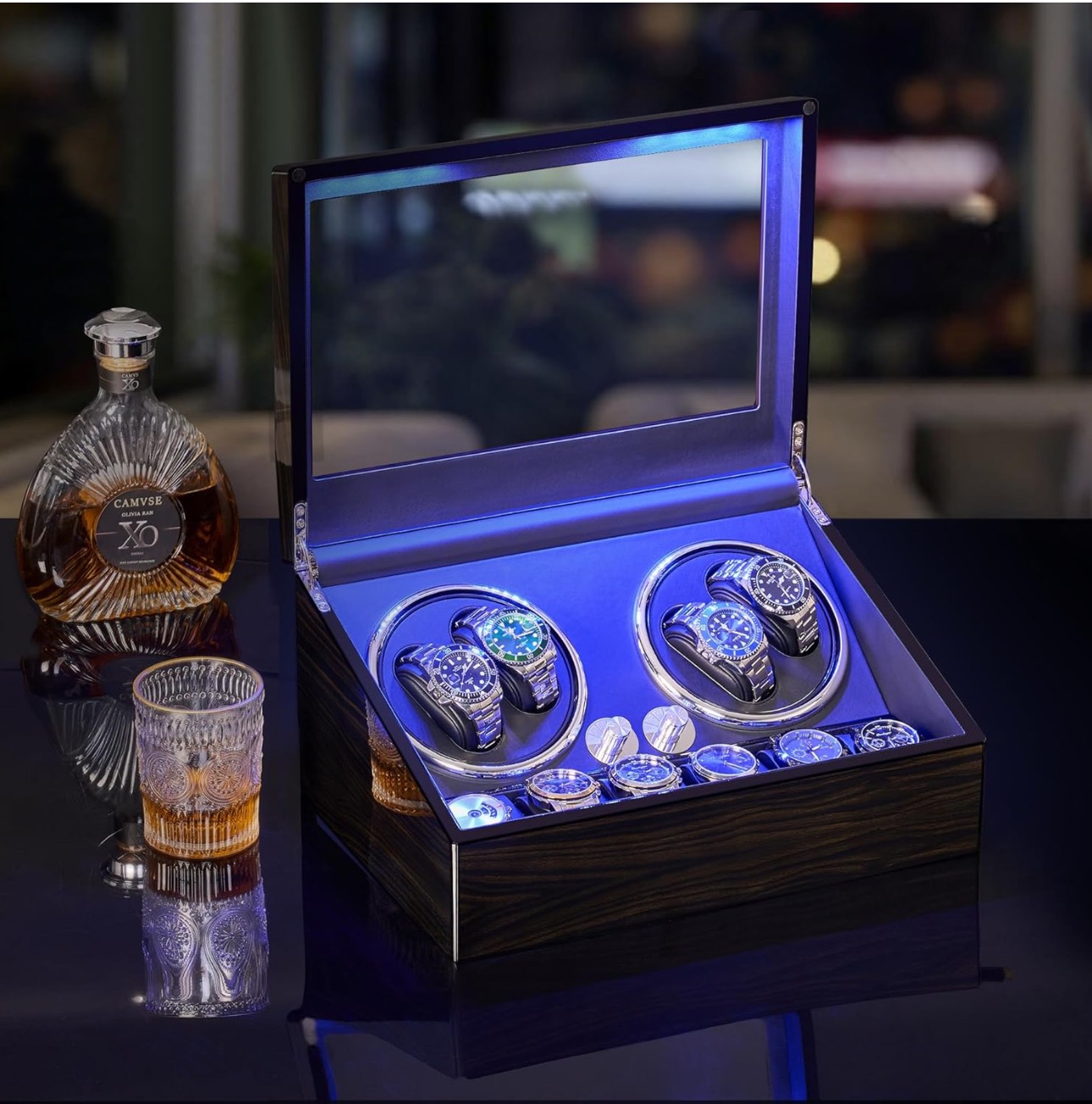 دستگاه کوک ساعت ANWBROAD برای ساعتهای اتوماتیک، 4 چرخاننده ساعت و 6 محفظه اضافی با موتور فوقالعاده بیصدا و چرخاننده نور پسزمینه LED، شیکر فیبر کربنی 5 حالت چرخشی، USB، مدل JWW002