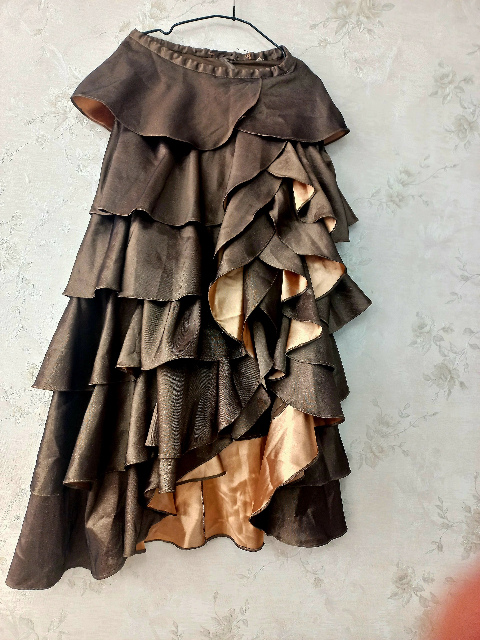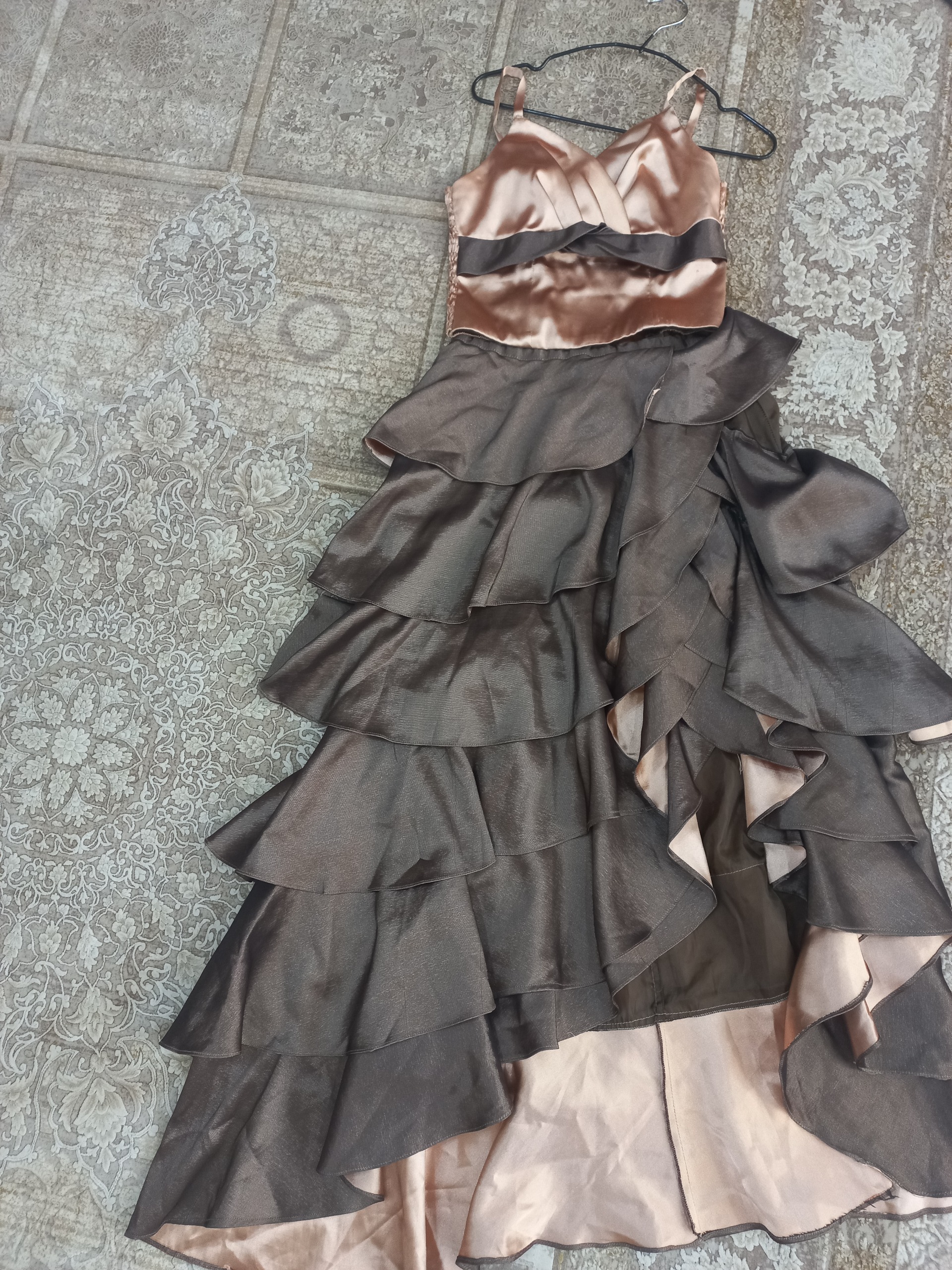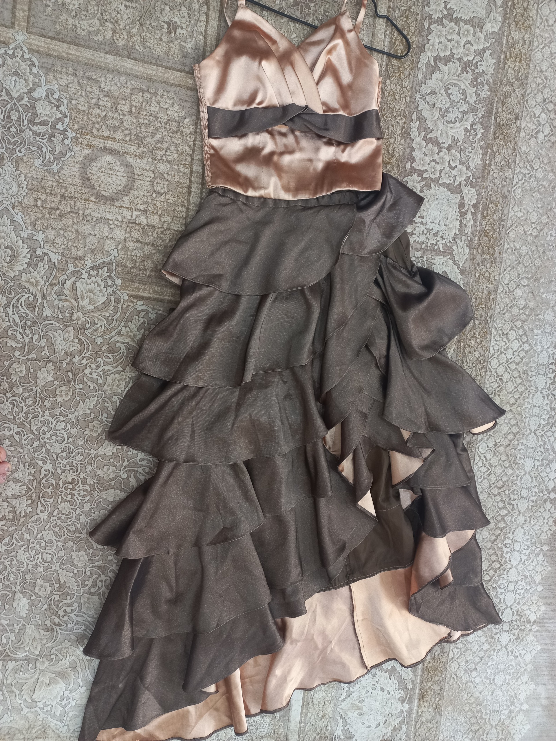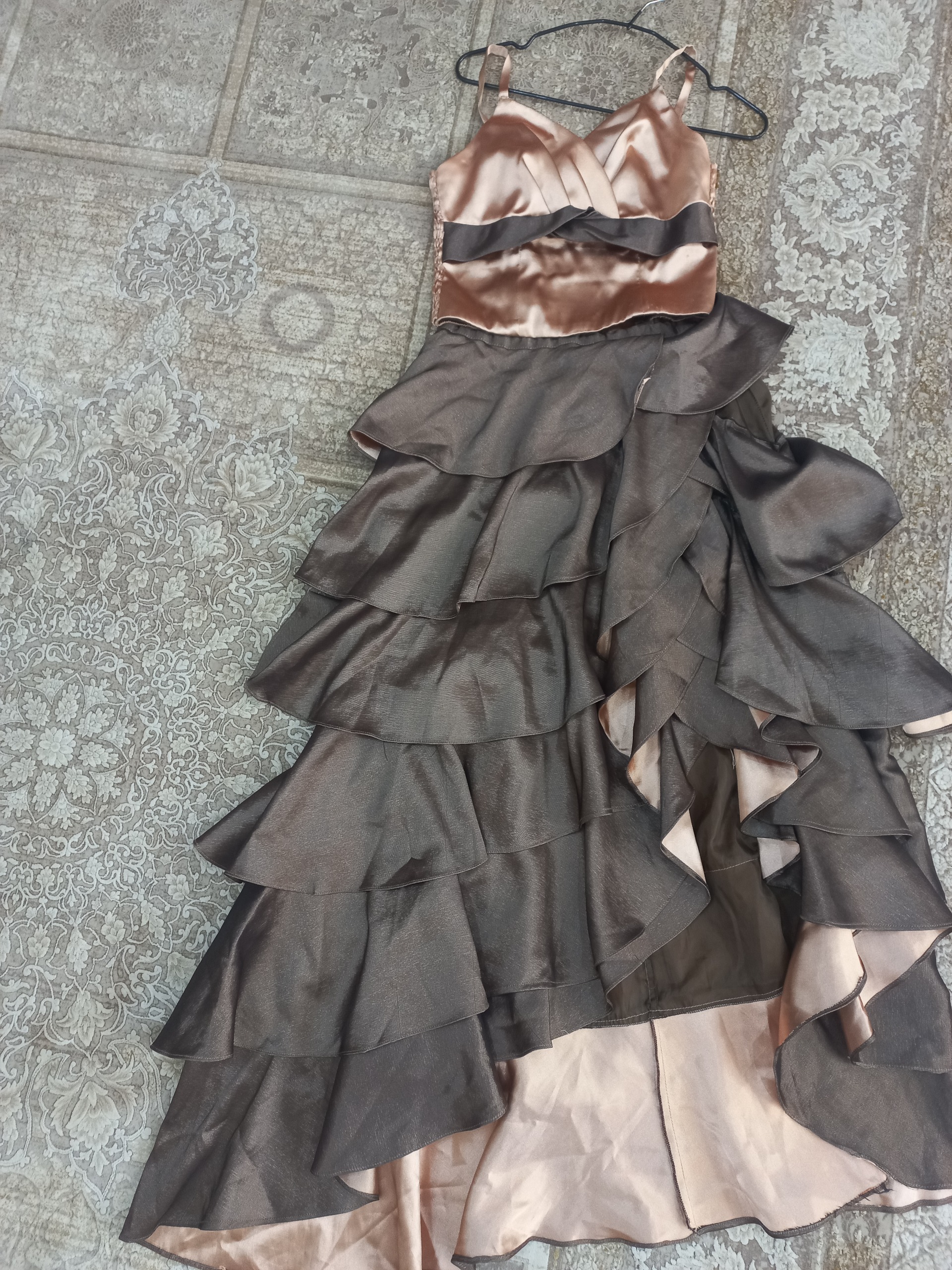 دوتکه بسیار تمیز و شیک دامن و لباس طرح گل هستش رنگش کرم طلایی ملیح و خوشرنگیه