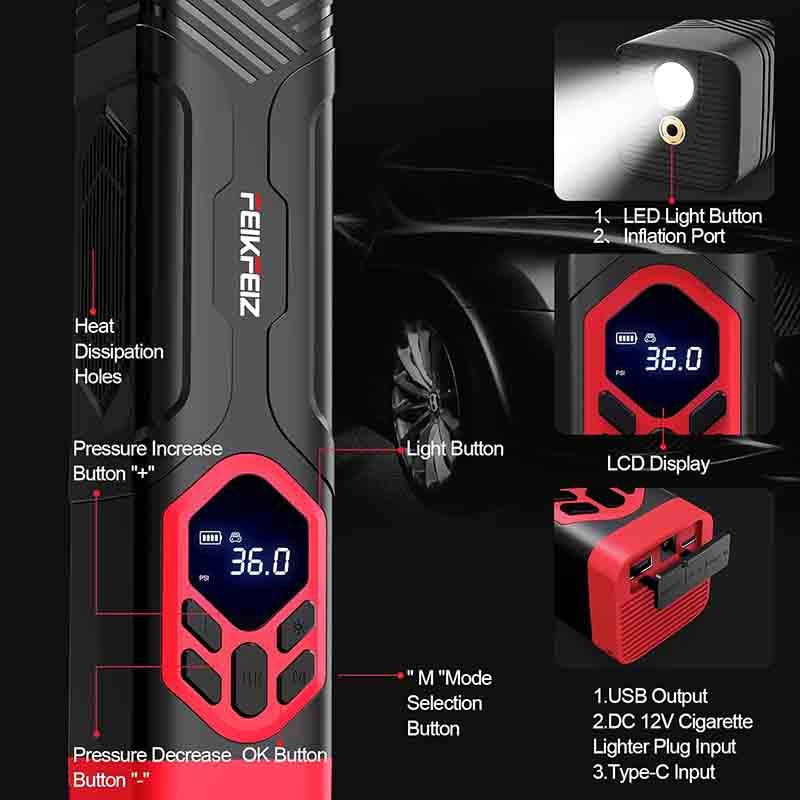 عملکرد خاموش شدن خودکار: دارای تشخیص خودکار فشار باد تایر و قابلیت برنامه ریزی برای تنظیم باد آن است. این دستگاه 4 واحد اختیاری (PSI، BAR، KPA، KG/CM²) میدهد. با سه دکمه "M، +، -"، میتوانید واحد مورد نظر را مطابق با نیاز شخصی خود تنظیم کنید. پس از رسیدن به فشار از پیش تعیین شده، پمپ تایر به طور خودکار خاموش می شود. این بدان معناست که دیگر لازم نیست نگران باشد بیش از حد یا فشار باد خیلی کم تایر باشید.