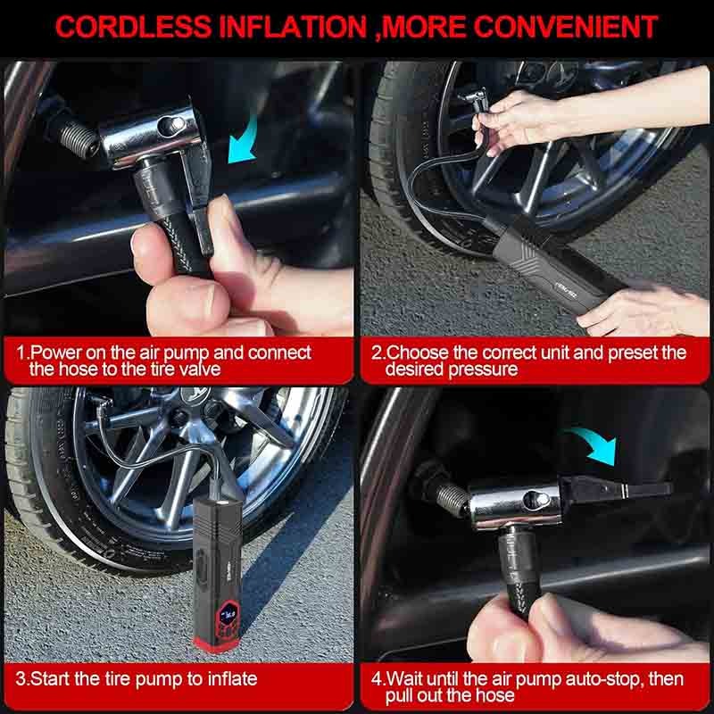 منبع تغذیه دوگانه و حالتهای کاری دوگانه: با باتری داخلی 5200 میلیآمپر ساعتی، کمپرسور هوای قابل حمل در شارژ کامل، 4 لاستیک خالی را باد کند. اگر در طول سفر تمام شد، نگران نباشید. ما همچنین یک آداپتور برق خودرو 12 ولت DC 3.5 متری را به عنوان منبع تغذیه پشتیبان ارائه میدهیم تا بدون برق شرمنده نشوید.
