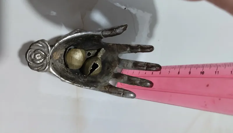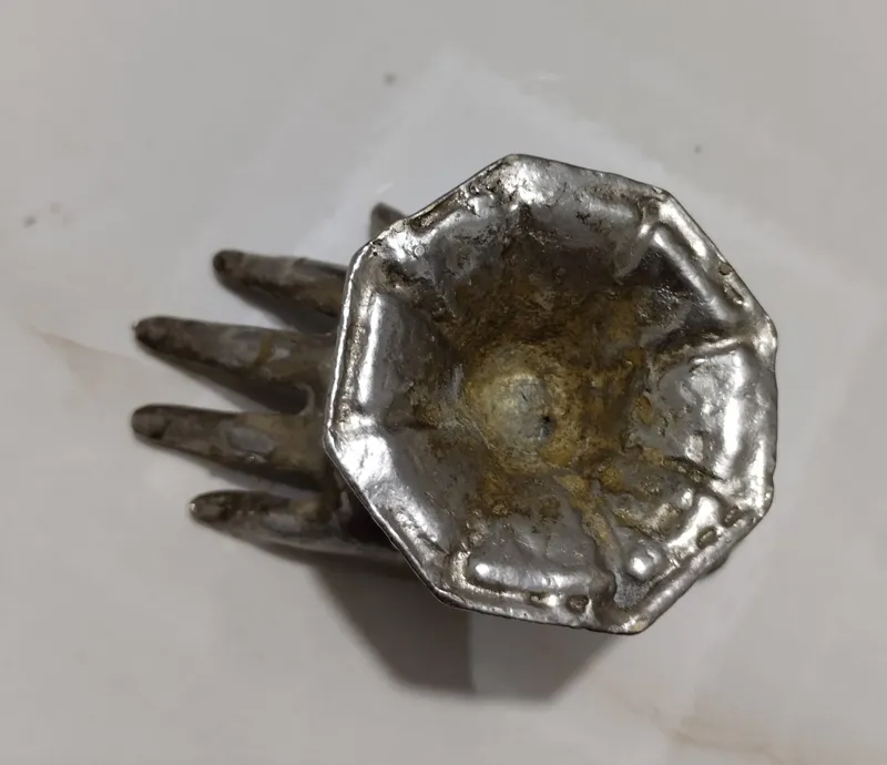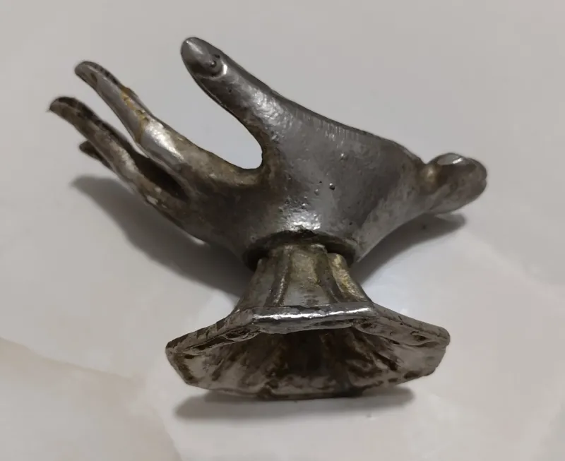جا سیگاری وشاید کاربرد دیگری داشته باشد طرح خاص انگشتان انسان به زیبایی طراحی شده.تمیز نشده.روکش ضخیم نقره.جنس اصلیشو نمی دونم ولی من به اسم برنز میفروشم.حرفی نباشه...مخصوص افراد خاص وسخت پسند