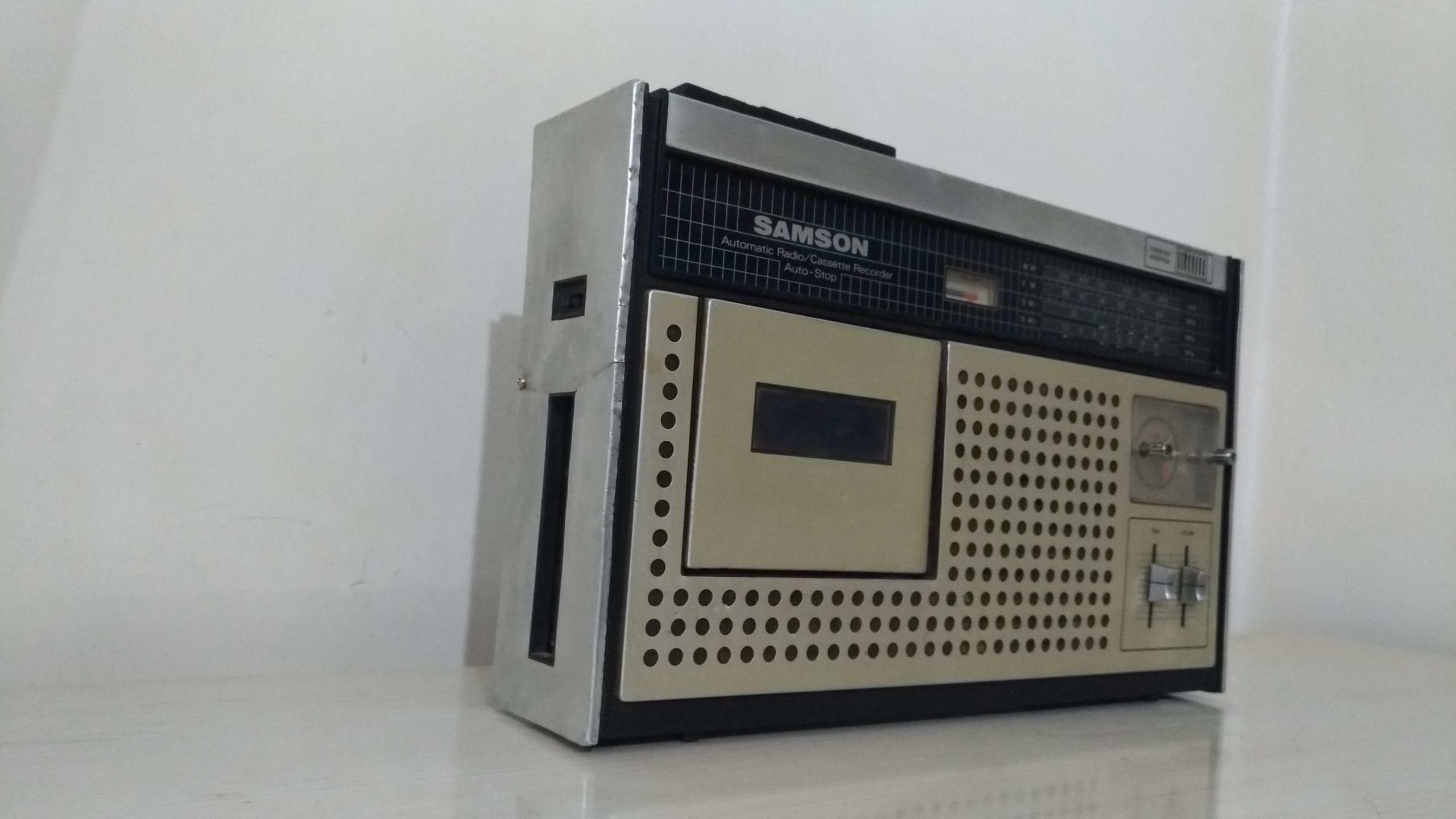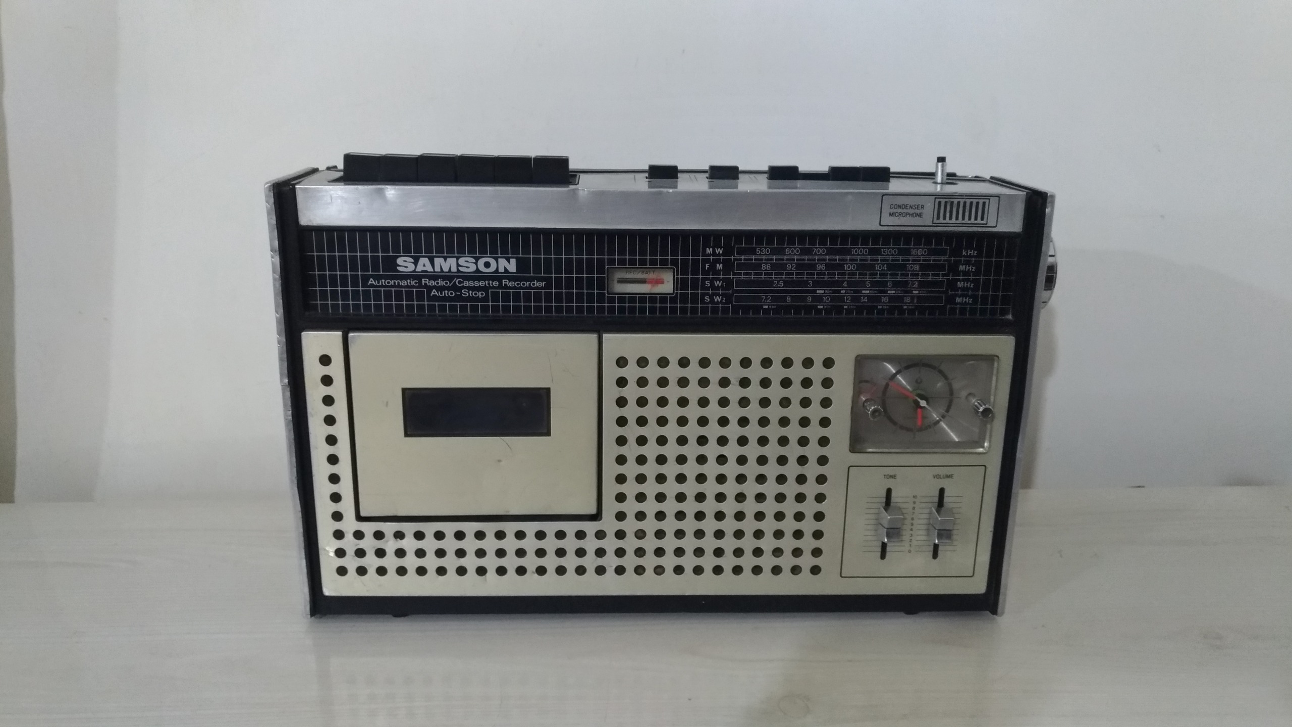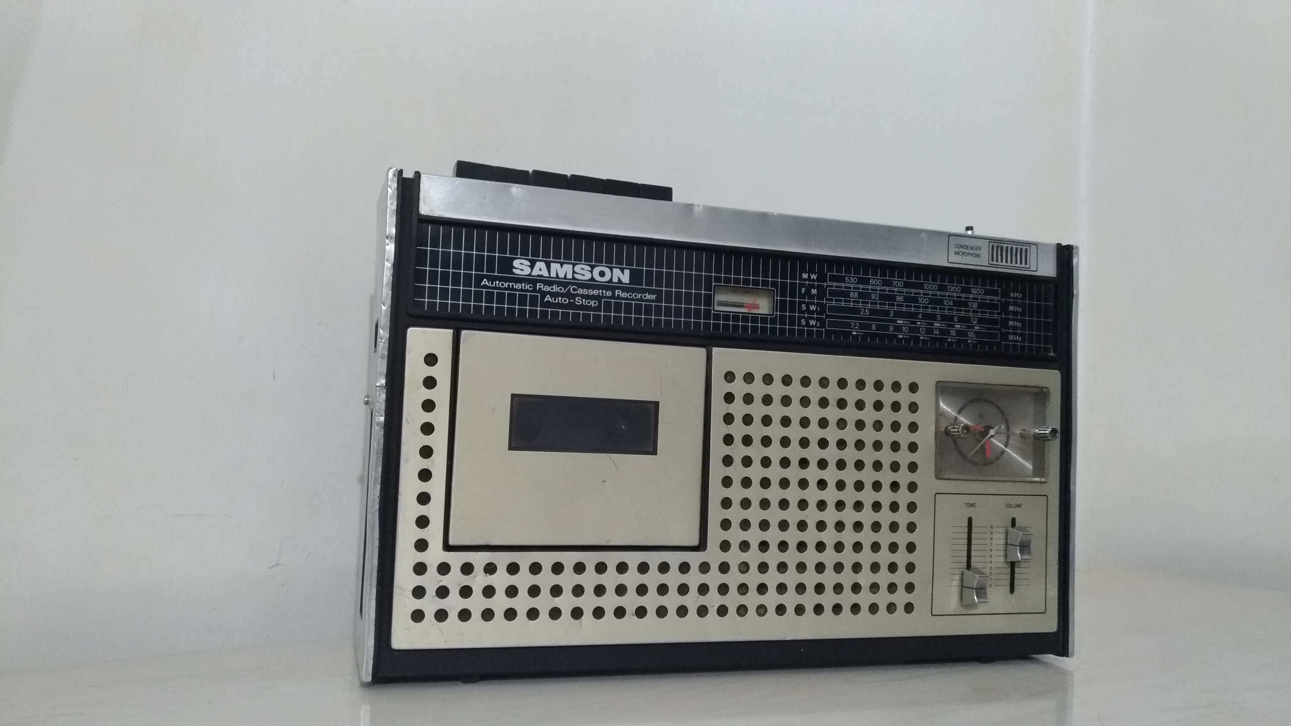 رادیو ضبط ساعت سامسون ژاپنی طبق تصاویر ،رادیو سالم ساعت سالم ،کاست هم کارمیکند منتها درب کاست وقتی بازمیکنی نواررو باخودش نمیاره بیرون باید بادست بیارید بیرون بدنه رو داخل تصاویر دقت کنید تااعتراض بعدی نباشد باتشکر