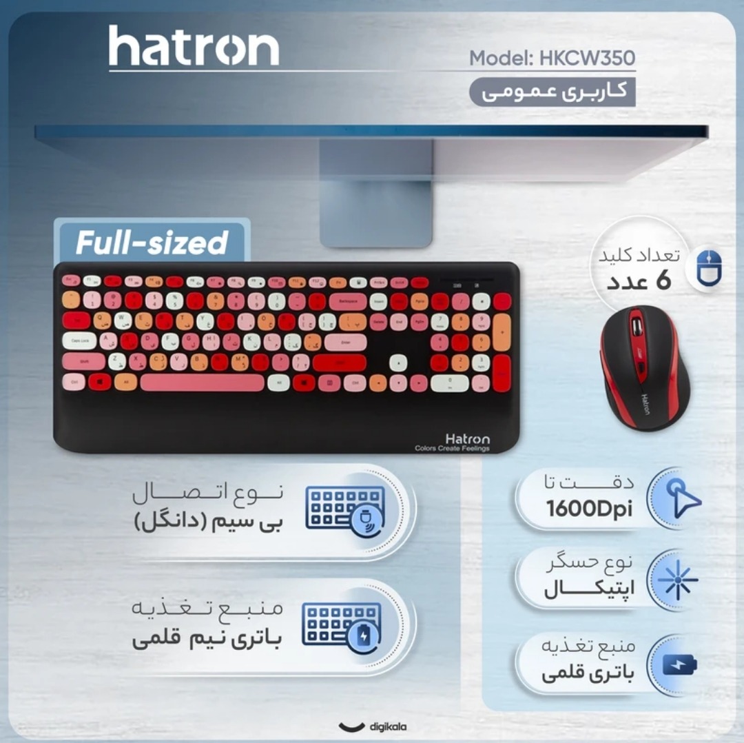 یک مجموعه بیسیم Full-Size است که برای استفاده اداری و خانگی طراحی شده است. این مجموعه با اتصال 2.4 گیگاهرتزی، بردی تا 10 متر را ارائه میدهد و با طراحی کمصدا، تجربهای راحت را برای کاربران فراهم میکند. کیبورد دارای 106 کلید شامل 12 کلید میانبر است که به کاربران امکان دسترسی سریع به عملکردهای پرکاربرد مانند ماشینحساب و کنترل رسانهها را میدهد. حروف فارسی حکشده روی کلیدها نیز تایپ فارسی را آسانتر کرده است. این کیبورد از طریق یک دانگل USB به کامپیوتر متصل شده و Plug & Play است، یعنی بدون نیاز به درایور یا تنظیمات خاصی قابلاستفاده خواهد بود. طراحی آن شامل استراحتگاه مچ دست (Wrist Rest) است که از خستگی دست در استفاده طولانیمدت جلوگیری میکند. منبع تغذیه کیبورد، یک باتری نیمقلمی (AAA) است که مصرف بهینهای دارد. ماوس این مجموعه دارای 6 کلید فیزیکی و حسگر اپتیکال با دقت 800 تا 1600 DPI است که عملکردی دقیق و روان را در اختیار کاربران قرار میدهد و مانند کیبورد از طریق دانگل USB متصل شده و انرژی خود را از دو عدد باتری قلمی (AA) تامین میکند. در مجموع، هترون HKCW350 یک انتخاب مقرونبهصرفه، بادوام و مناسب برای استفاده روزمره در منزل و محل کار است.
