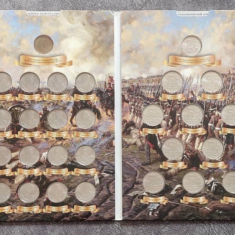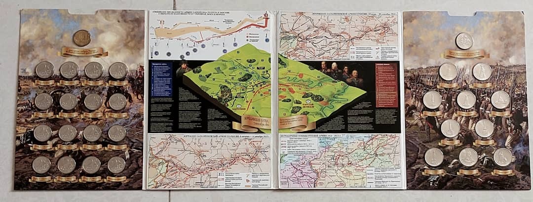 ست کمیاب سکه های یادبودی روسیه به مناسبت دویستمین سالگرد پیروزی روسیه بر ناپلئون در سال 1812.تعداد 28 عدد سکه کاملا بانکی در آلبوم گلاسه براق.با تصاویر ژنرالهای روس و بناهای یادبودی.