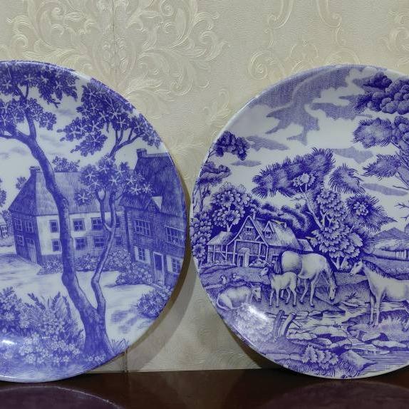 دو عدد ملامین آبی قدیمی کمیاب با نقش های متفاوت به قطر 22 و 23 سانت.فروش یکجا