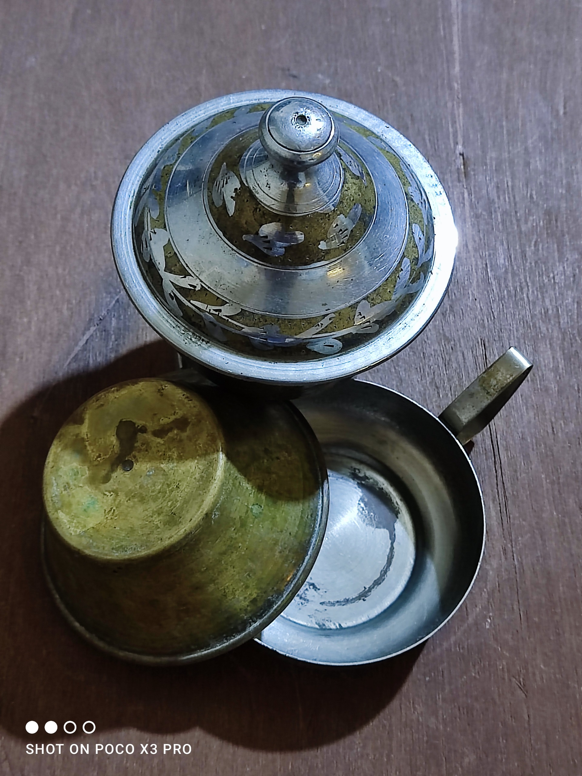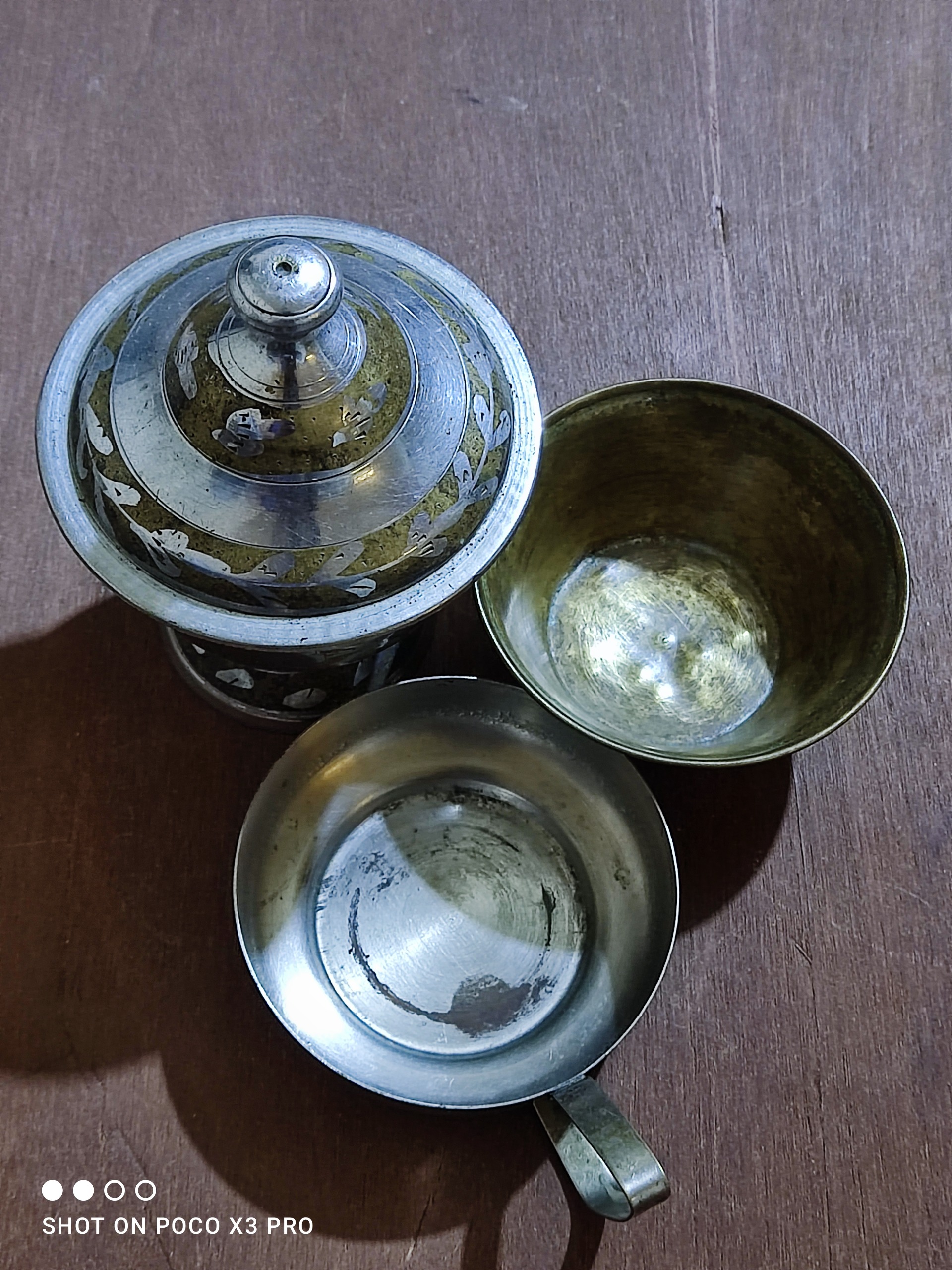 سه عدد برنجی قدیمی مطالق تصاویر یک عدد قندان برنجی قدیمی بسیار محکم و سنگین /// یک عدد کاسه برنجی سایز کوچک/// و یک عدد نبات خوری برنجی قدیمی دسته دار قیمت برای هر سه مورد میباشد