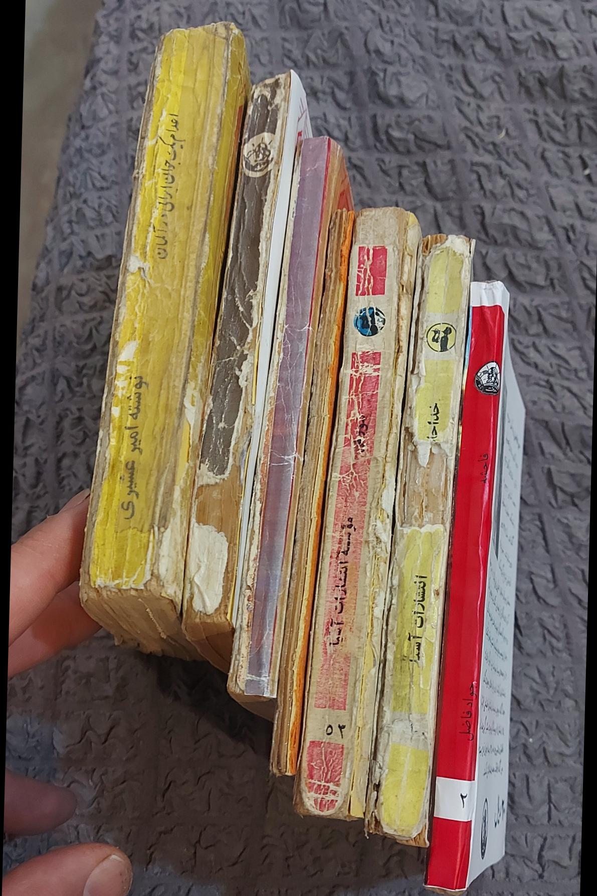 تسمه چرمی : جلدپشت کپی رنگی و دوبرگ ار اول و 7 برگ از آخر کتاب کپی همرنگ و چند برگ کتب با چسب شیشه ای پارگی اصلاح شده