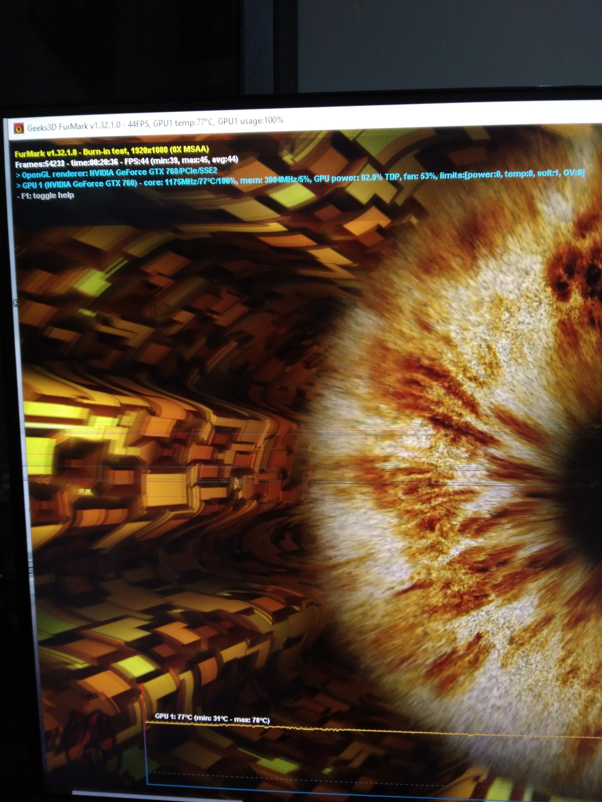 نتیجه تست فورمارک که نهایت فشار وارد شده به گرافیک در حدود 21 دقیقه و رزولیشن 1920*1080 FHD که در عکس آخر قرار داده شده (مشاهده فرمایید) دما کارت نهایت به 77 درجه میرسه که نشان از سلامت گرافیک میباشد