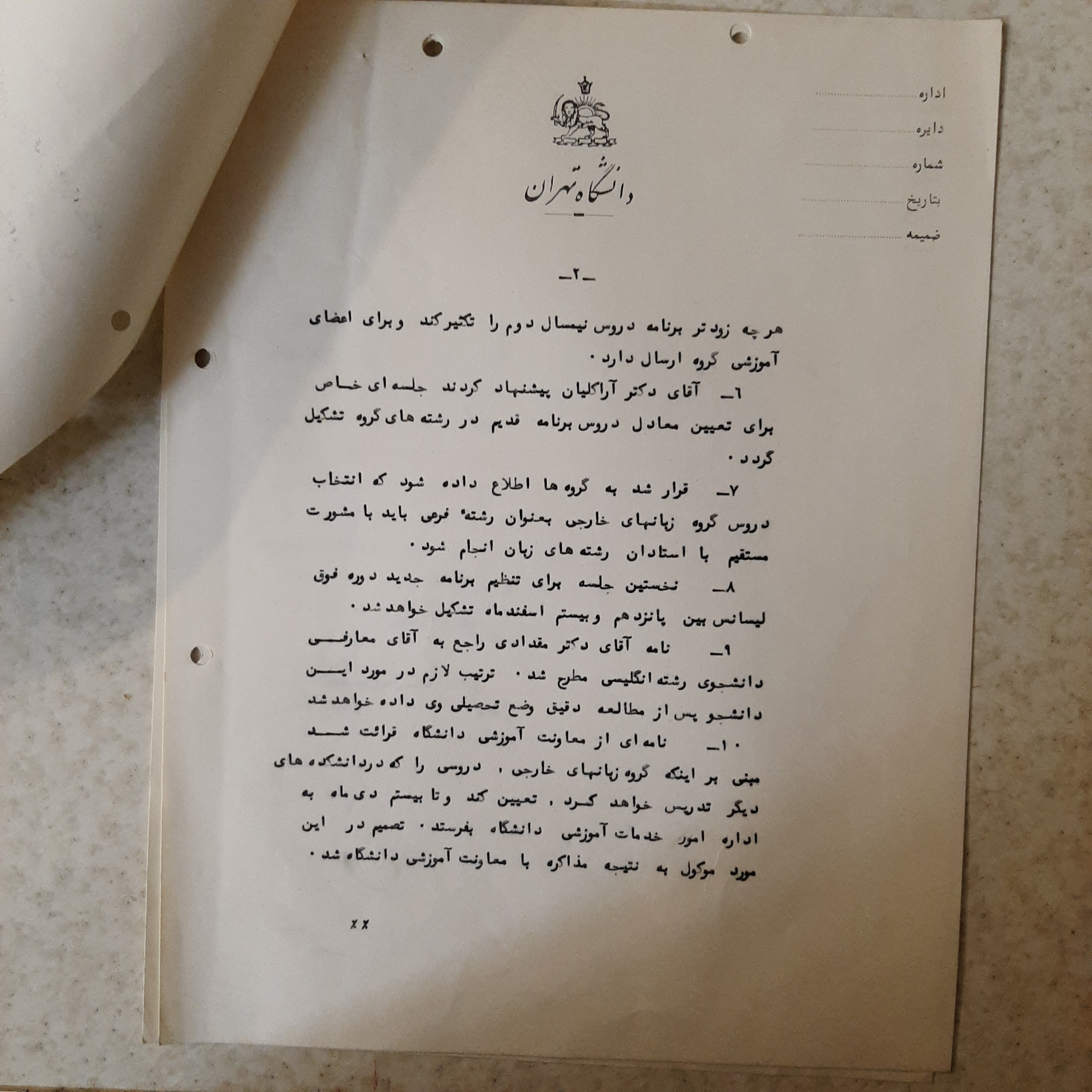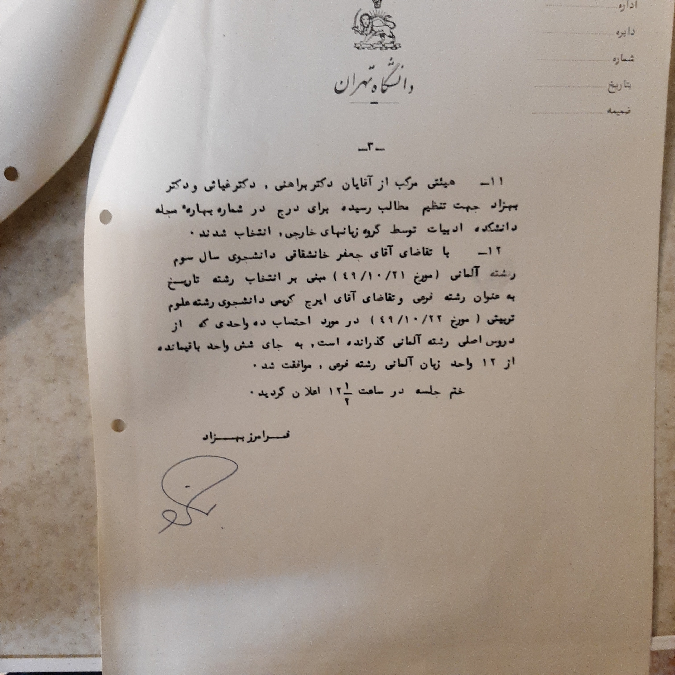 این نامه با سربرگ دانشگاه تهران صورتجلسه جلسه ای هست با حضور دکتر رضا براهنی و دکتر مهری آهی و دکتر بهرام مقدادی و دکتر آراکلیان و ....