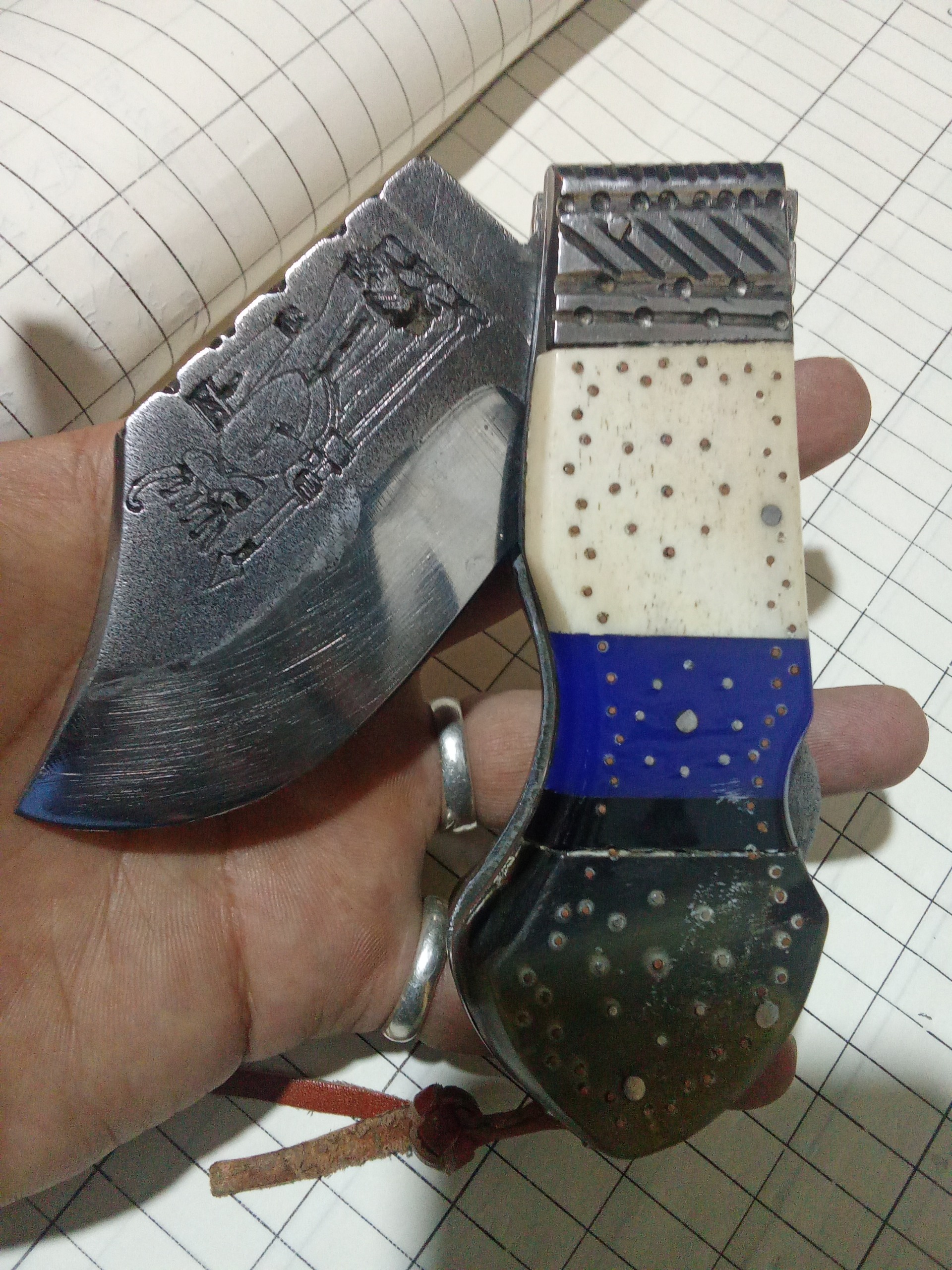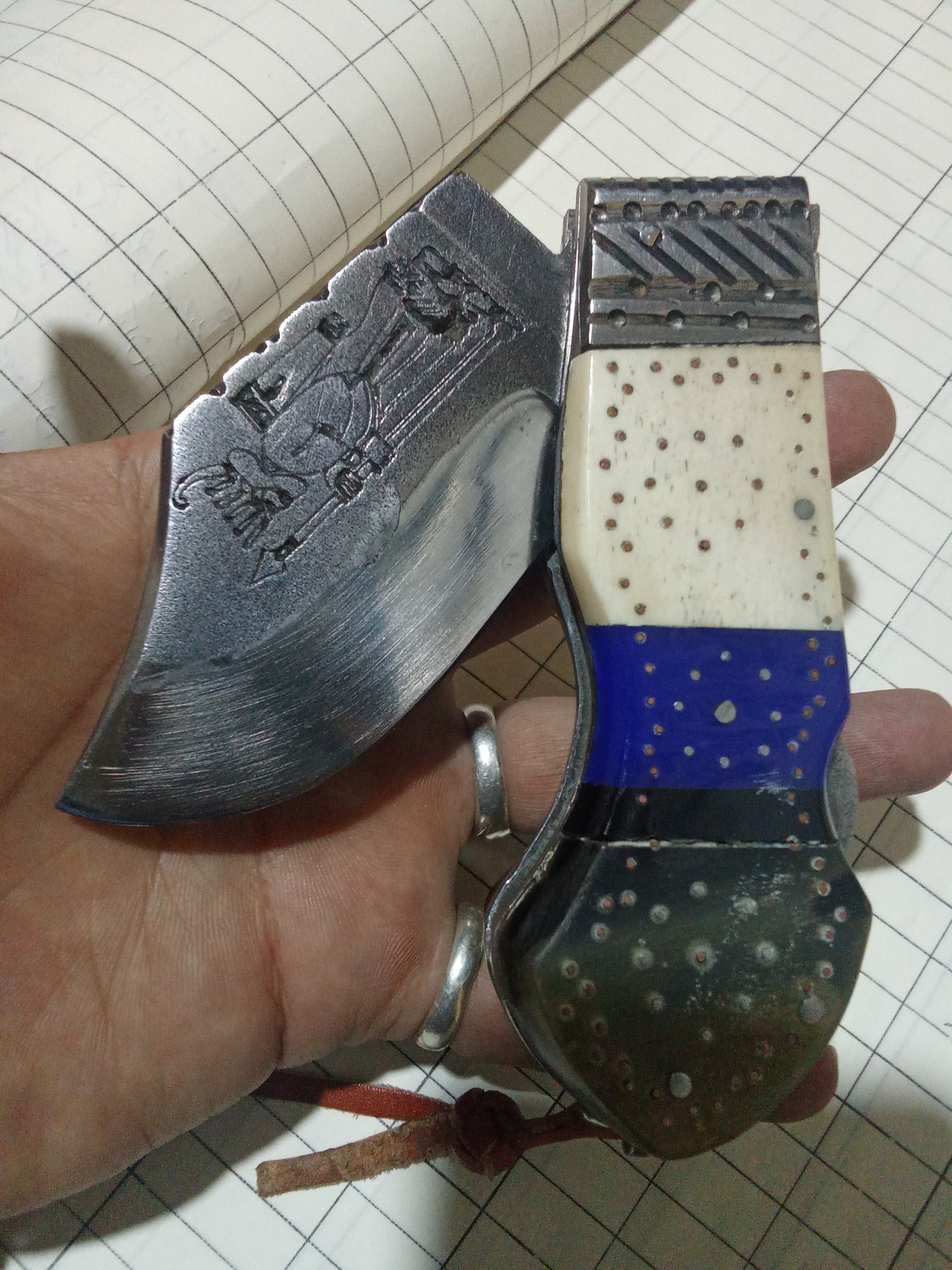 چاقو کلکسیونی بابا قواره درشت حکاکی شده روی تیغه با غلاف چرم دست ساز