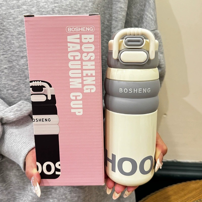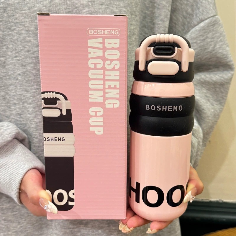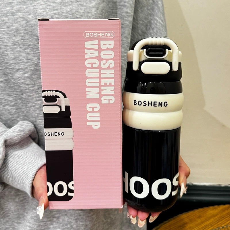 فلاسک استیل اسپرت BOSHENG مدل BW-1956 ظرفیت 500 میلیلیتر با طراحی ساده، رنگبندی مشکی، نقرهای و کرمی، درب قفلدار ضدنشت و بند حمل مقاوم در فروشگاه استنلی گناوه (واردکننده انواع ماگ، تراول ماگ و فلاسک بهصورت مستقیم و بدون واسطه) با بهترین