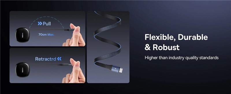 در شاررژ فندکی Baseus cctxp-cc علاوه بر درگاه Type-c، از یک کابل متصل نیز استفاده شده است. وجود این کابل متصل کمک میکند که شما علاوه بر درگاه Type-c، بتوانید به کمک کابل متصل و بدون نیاز به هیچ کابل دیگری، گوشی یا تبلت خود را شارژ کنید. توان این کابل شارژ نیز مشابه درگاه اصلی، 30 وات است. طول این کابل 70 سانتی متر بوده و به سادگی میتوانید آن را باز کرده و جمع کنید. همچنین در تولید این کابل از آلیاژ آلومینیوم و پلاستیک TPU استفاده شده که هم رسانایی و هم مقاومت این کابل را بالا میبرد.