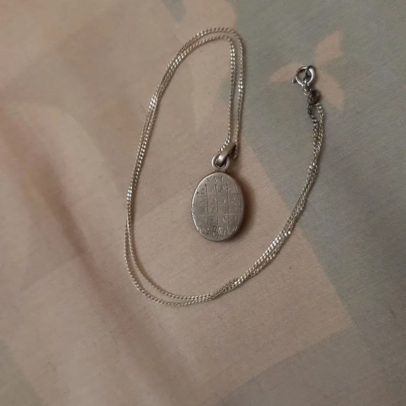 آویز و گردن نقره که زنجیر نقره 925 هست و آویز آن پایه نقره اصل 925 و تمام سنگهای اصل هست و دعای شرف شمس دعای حرز امام جواد و رزق روزی و طواف داده شده و قدیمی هست