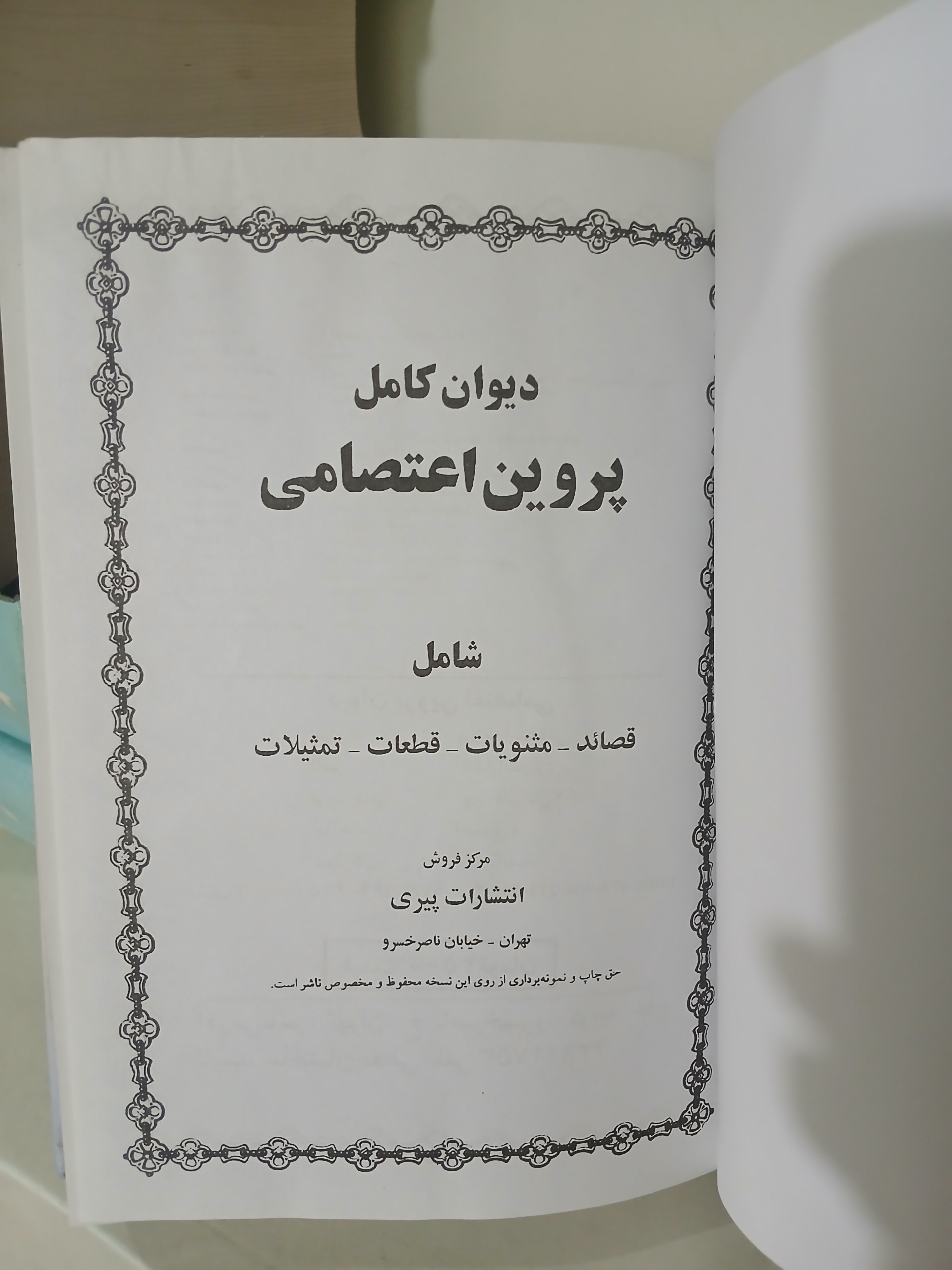 دیوان کامل پروین اعتصامی شامل قصائد، مثنویات، قطعات و تمثیلات با مقدمه مرحوم ملکالشعرای بهار.