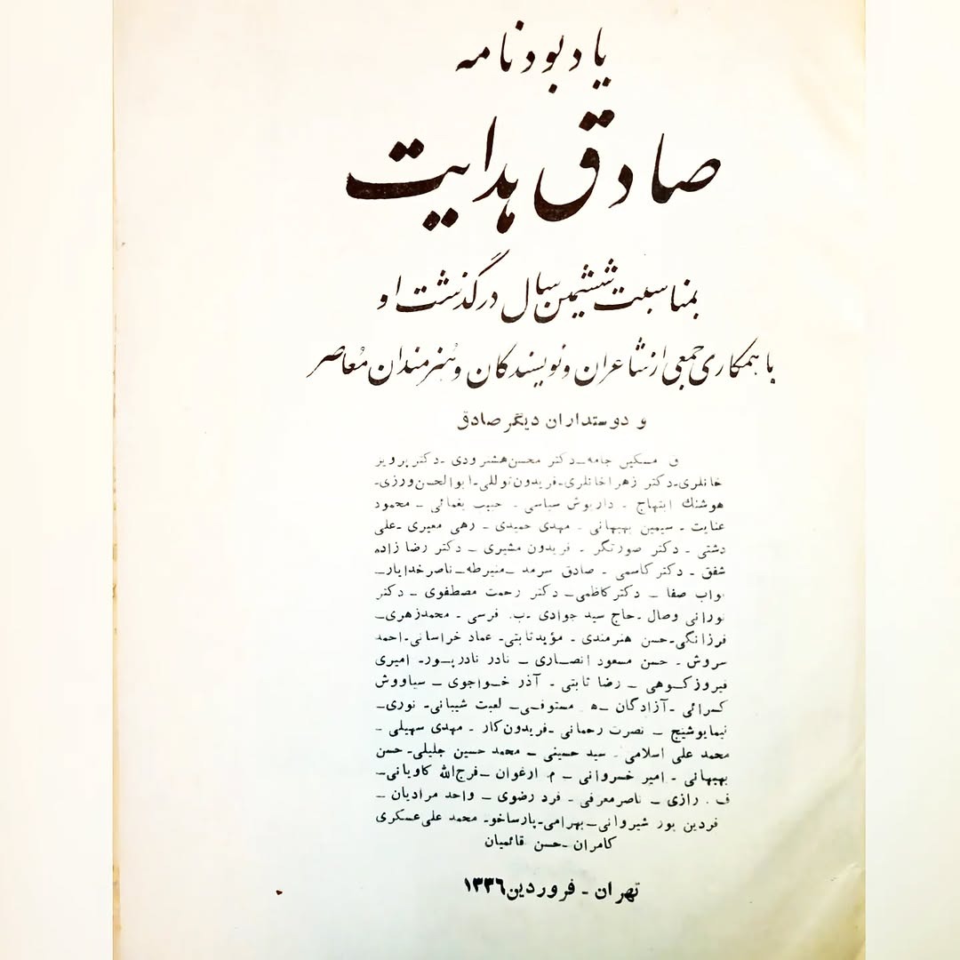 بمناسبت ششمین سال درگذشت صادق هدایت، کتاب حاضر با همکاری جمعی از شاعران و نویسندگان و هنرمندان معاصر یادبودنامه ای در 4 بخش در فروردین 1336 به چاپ رسید. این کتاب علاوه بر مطالبی درباره صادق هدایت از طرف شاگردان و دوستداران وی، شامل مقالات ادبی گوناگونی است