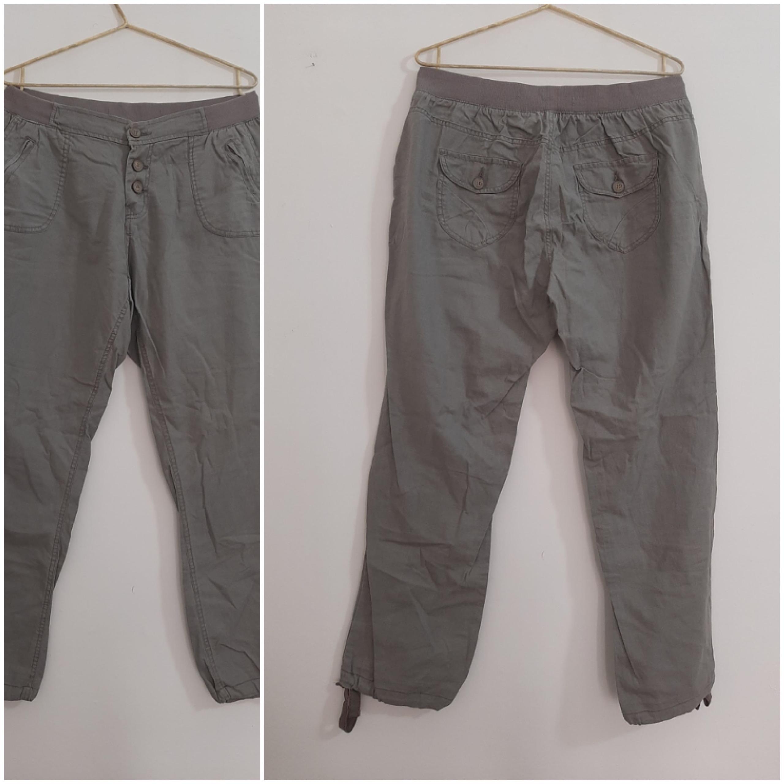 شلوار کتان . اندازه عرض کمر 40 سانتی متر ، قد 100 سانتی متر . قسمت جلوی کمر دکمه دارد و قسمت پشت کمر کشی است . قسمت مچ پا گت قابل تنظیم دارد .