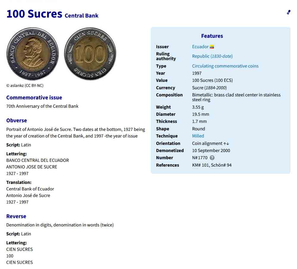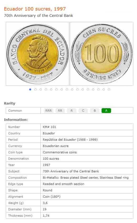 سکه یادبودی 100 سوکره اکوادور 1997 (نایاب)