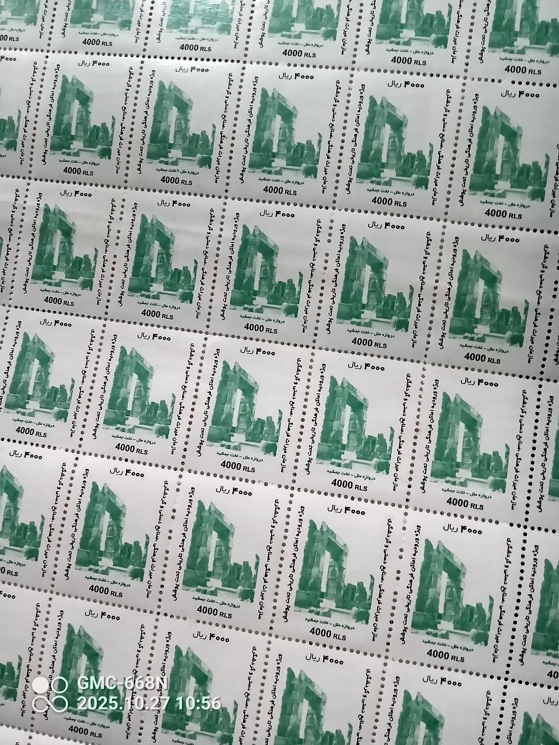 باعرض سلام تمام ارقام 6رقم توجه فرمایید ورق 4000ریال تاشدگی از وسط و باند افقی پایین هم تاشدگی دارد ازپشت تمبر هم چند تمبر آسیب دیده عکس بوضوح مشخص هست