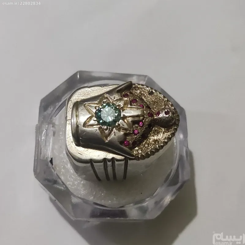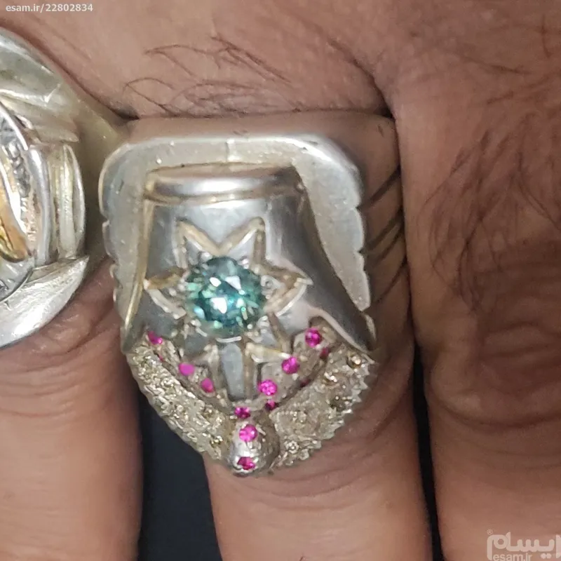 انگشتر نقره تاج با نگین موزانایت با مخراج کاری یاقوت سرخ و ده قطعه برلیان اصل به وزن 62.5گرم بسیار شکیل و خوش رخ برای مشکل پسندان